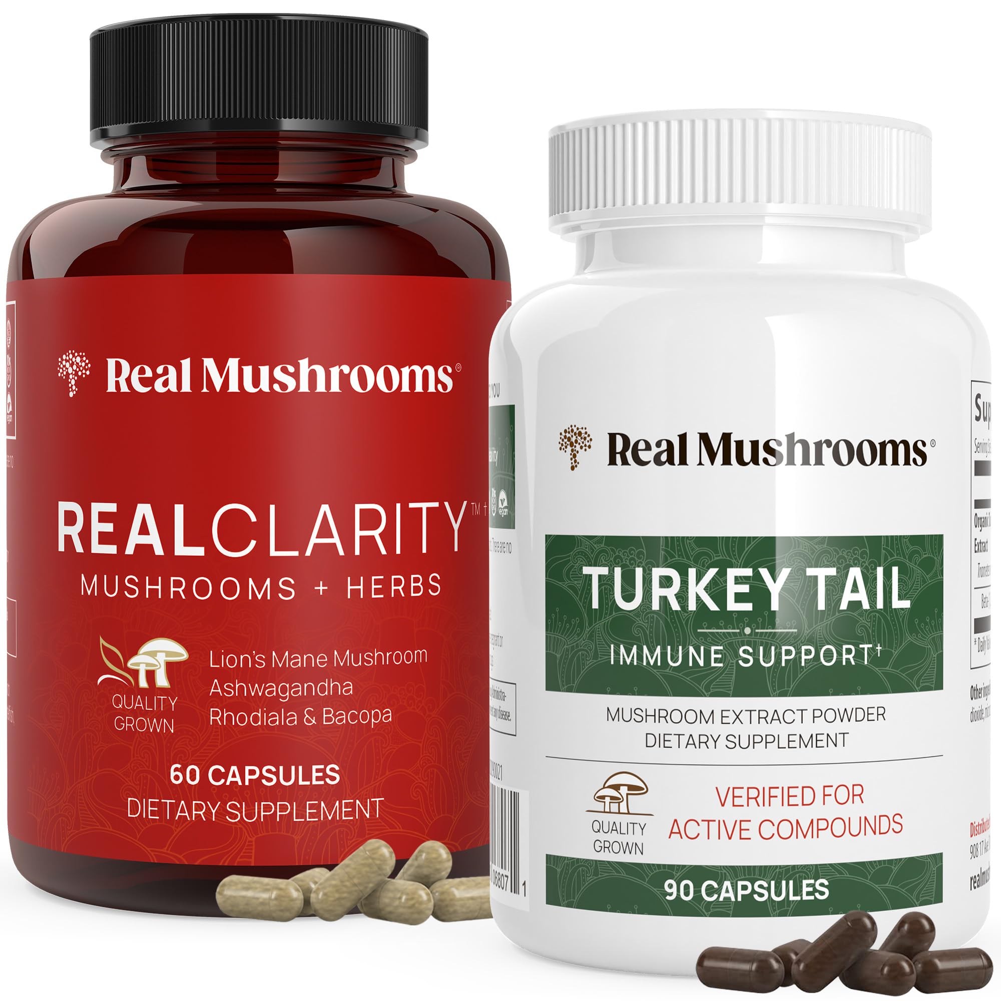 Real Mushrooms RealClarity (60ct) and Turkey Tail (90ct) Capsules Bundle - Mushroom Supplement for Mental Clarity Focus & Immune Support - Vegan Non-GMO Verified Levels of Beta-Glucans