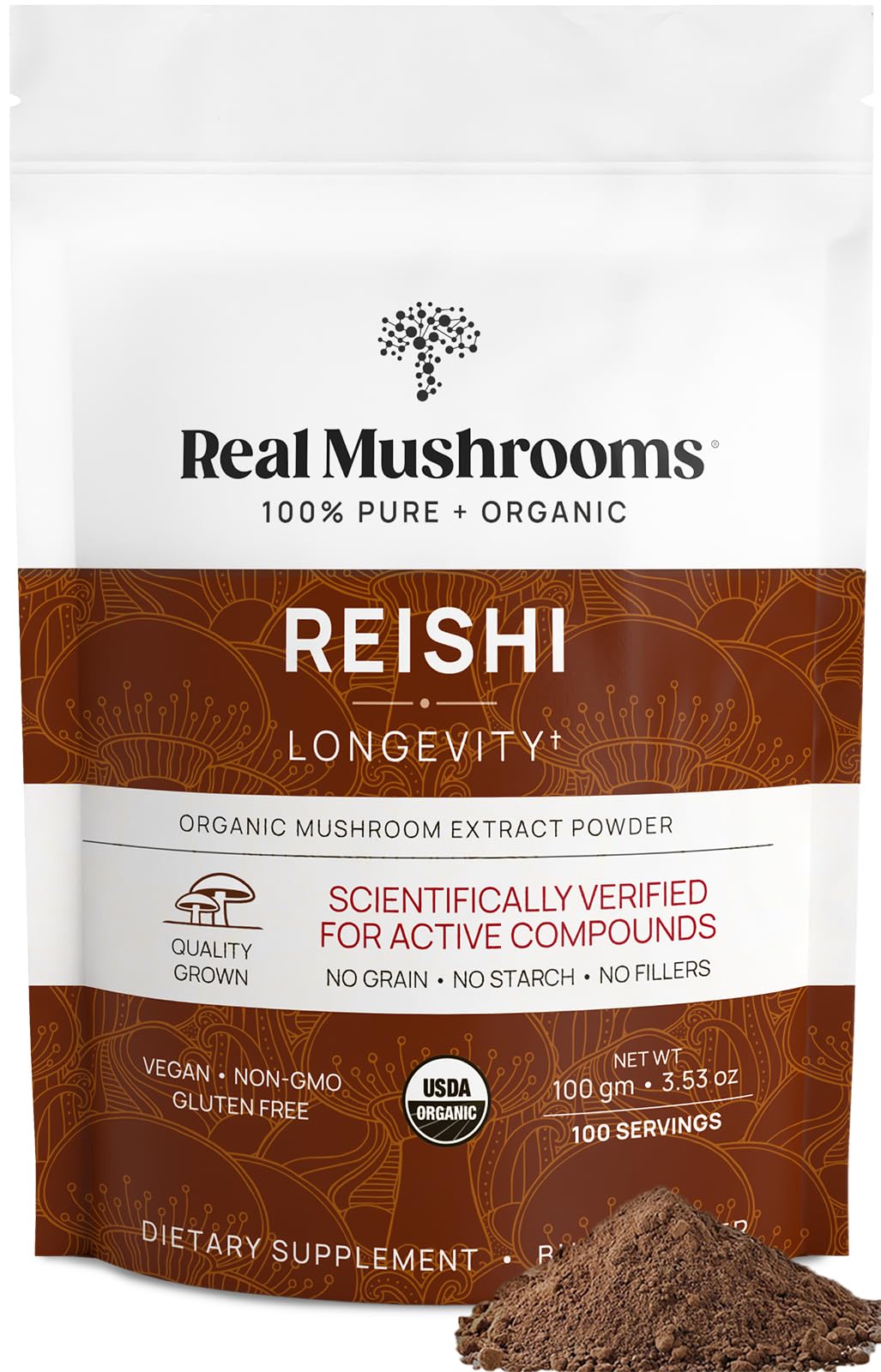 USDA Organic, Vegan Gluten-Free: This real mushrooms reishi product is USDA Organic, vegan, non-GMO, and gluten-free—crafted with 100 organic mushrooms only. NSF Certified for Dietary Supplements: Ensuring the highest standards of quality, purity, and safety. How to Use – Versatile Daily Routine: Add 1 gram of reishi powder to coffee, tea, or smoothies daily. An easy way to support your mushroom routine without capsules. 25 Beta-Glucans – Third-Party Verified: Lab-tested to ensure over 25 beta-glucans per serving. Manufactured in the USA using a time-tested, high-quality process. No Additives, Fillers, or Grain: A clean-label mushroom extract supplement with no starch, carriers, or synthetic ingredients—just real mushrooms. 100 Red Reishi Mushroom Extract: Made from organic red reishi mushroom extract using only fruiting body—no grain, mycelium, or fillers for a pure mushroom powder formula.