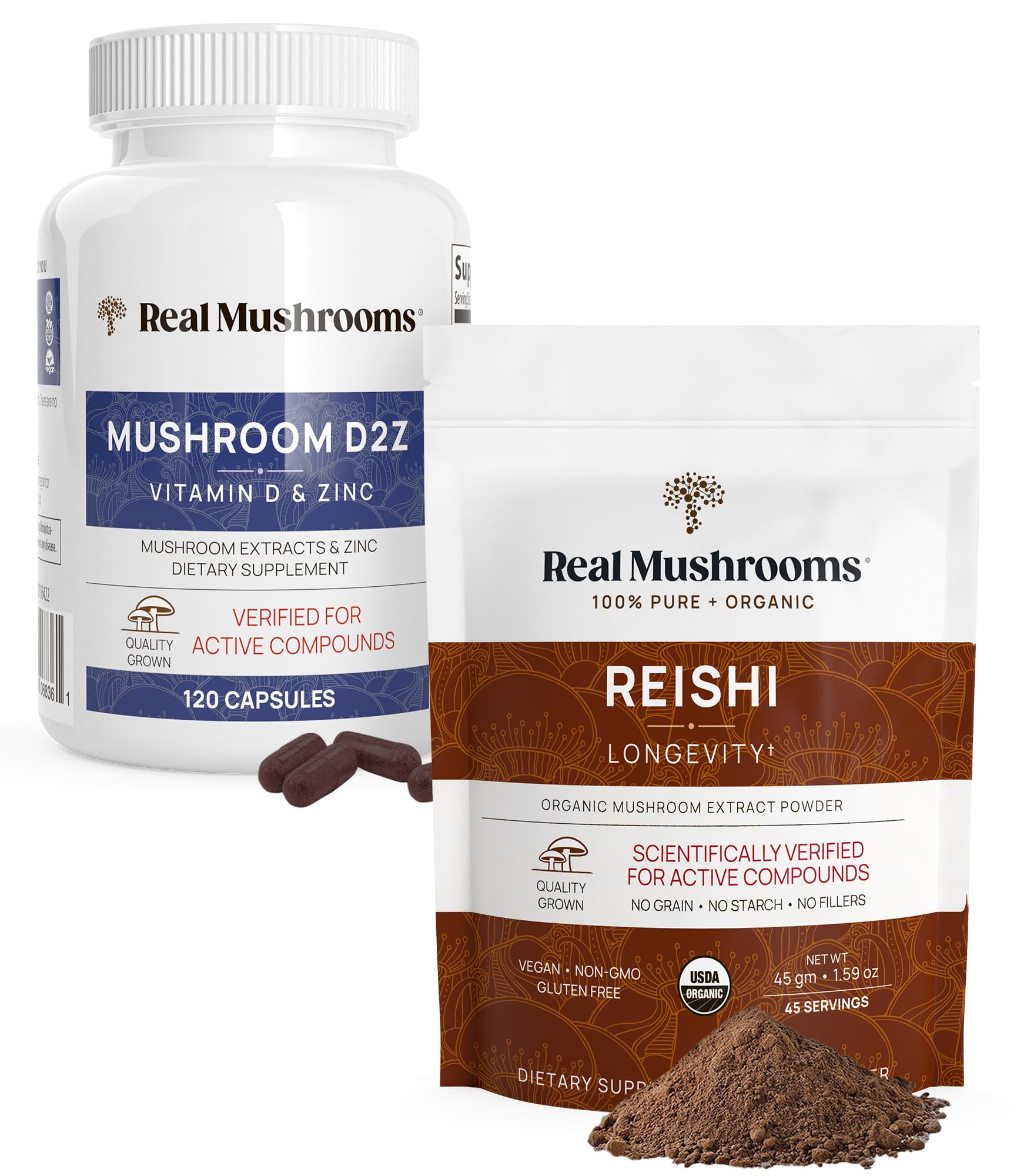 Real Mushrooms is committed to providing you with the best possible medicinal mushroom extracts in their purest form, without carriers or grain fillers. Made vegan, gluten free, non-GMO, and from 100 certified organic mushroom extracts - we strive to make sure our products are analyzed for important medicinal compounds via accredited 3rd party labs. Consistent with the existing body of mushroom research for quality and effectiveness, this 2-supplement bundle contains Reishi Extract Powder for Better Sleep and Relaxation (45 Servings) and Mushroom D2Z with Chaga and Reishi for Immune Support (120 Capsules)