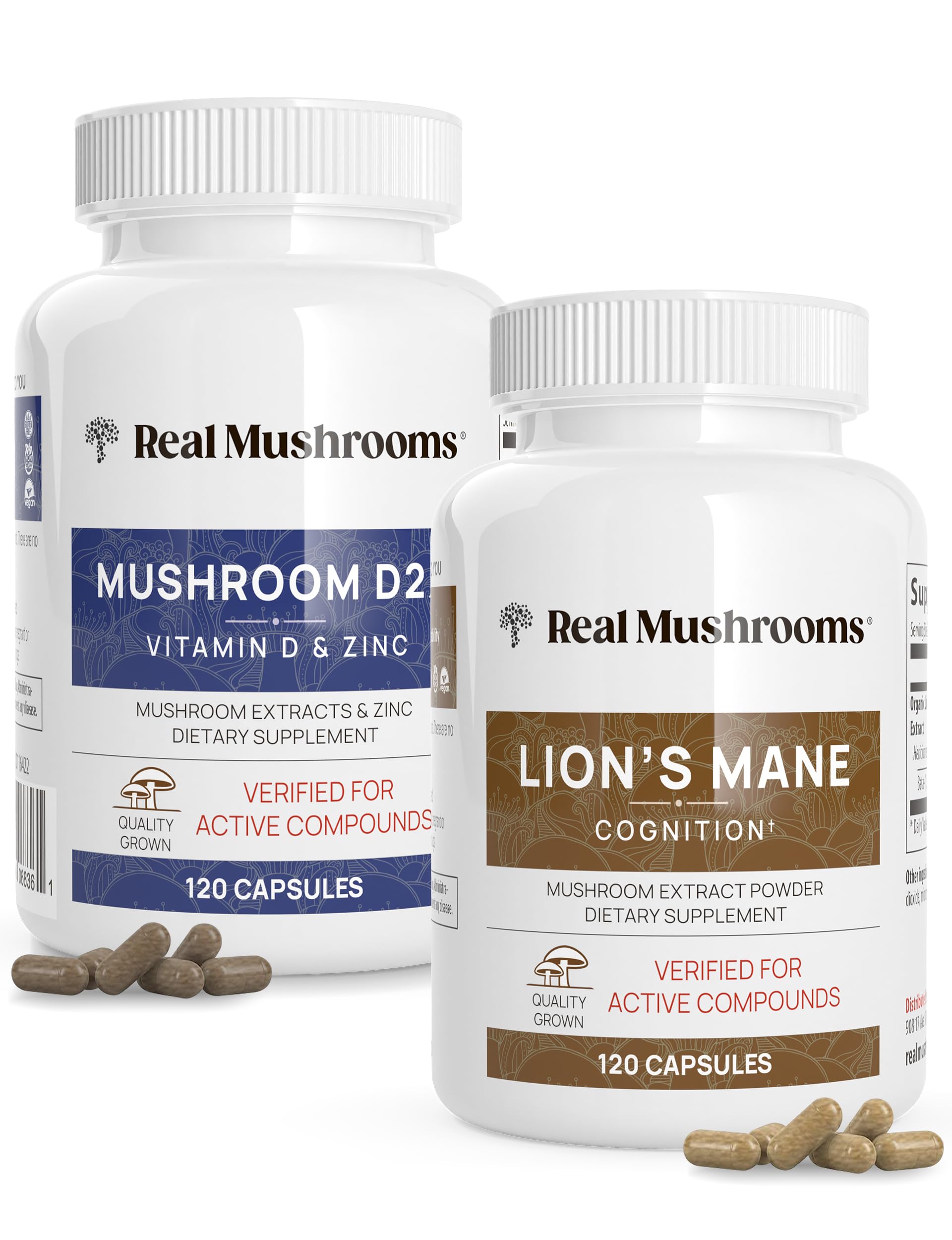 Real Mushrooms Vitamin D2 Zinc Chaga Reishi (120ct) and Lion's Mane (120ct) Bundle - Immunity and Cognitive Support Chelated Zinc for Improved Absorption - Vegan Gluten Free Non-GMO