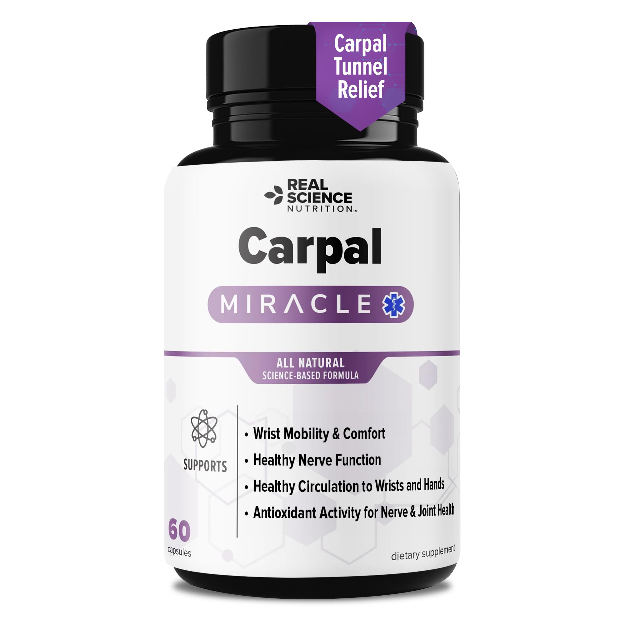 Real Science Carpal Miracle All Natural Carpal Tunnel Relief & Wrist Support Supplement with Vitamins B6 B12 C D K + GABA Hand & Nerve Comfort Made in USA 60 Caps