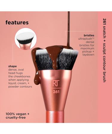 PRODUCT DESCRIPTION The Real Techniques Snatch Sculpt Contour Makeup Brush features a dense, oval head that perfectly hugs the contours of the cheekbones for natural, lifted definition. The 261 makeup brush's oval-shaped head is curved to effortlessly define and lift facial contours. Our contouring brush works with all liquid, cream, and powder contours and bronzers. With maximum pickup, precision application, and targeted shapes – this triple threat design will level up your daily routine. This sculpting brush features a NEW custom-cut oval head shape and UltraPlush, high-quality, dense bristles for maximum pickup and laydown. To make your tools last longer, it is recommended to clean you brushes once a week using the Real Techniques Brush Sponge Cleansing Gel. As with all our RT products, this makeup brush is 100 vegan and cruelty-free. DIRECTIONS Sweep contour on with the flat top buff out any harsh lines. SAFETY WARNING Discontinue use if irritation occurs. See more