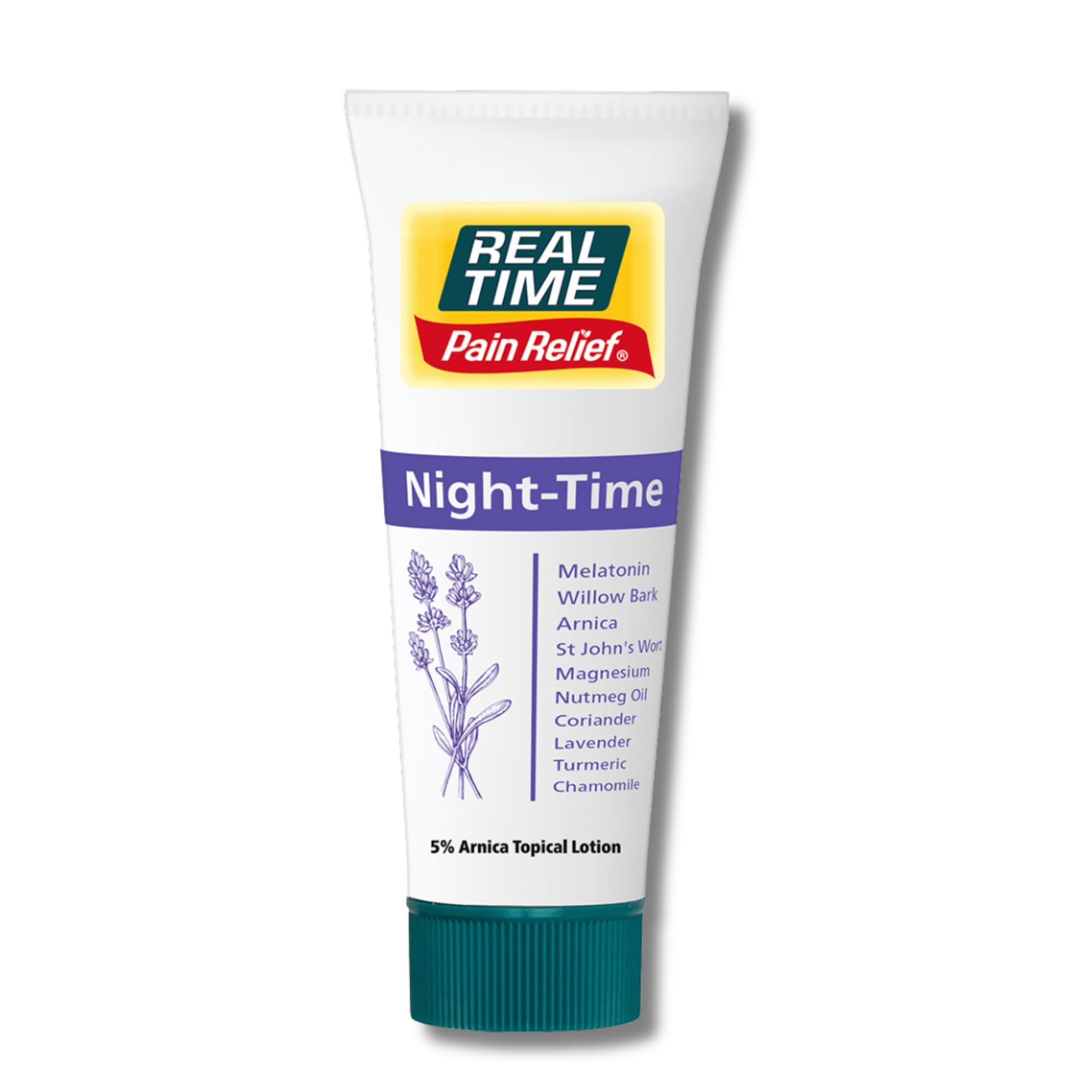 MADE IN THE USA SINCE 1998: Real Time Pain Relief's NIGHT-TIME is proudly formulated and packaged in the USA, adhering to stringent quality standards and supporting local production. Trust in the excellence and reliability of a product crafted with expertise and care. EASY APPLICATION: Simply apply to the affected area before bedtime. Allow the first layer to absorb, then reapply for enhanced comfort and deeper overnight relief. Provides you with effortless and effective relief for a consistent good night's sleep. LIGHTWEIGHT NON-GREASY: Fast-absorbing formula enriched with rosemary extract penetrates quickly without residue that leaves your skin soft, smooth, and refreshed for a clean, comfortable nighttime use. SLEEP-ENHANCING FORMULA: Infused with melatonin, lavender, and magnesium to calm tension, relax your body, and promote deeper, uninterrupted sleep while soothing discomfort naturally. ADVANCED NIGHT TIME RELIEF: Crafted with 22 natural ingredients including 5 Arnica to deliver deep targeted comfort for sore joints, muscles, and back pain to help you unwind and rest peacefully through the night.