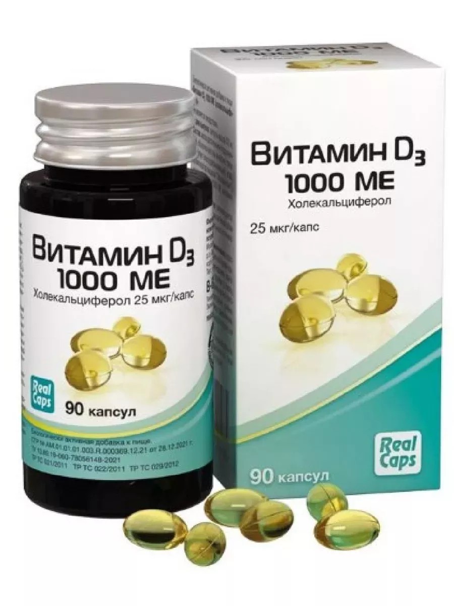 Витамин D3 1000 МЭ (холекальциферол) – это биологически активная добавка (БАД) к пище, которая содержит витамин D3. Данный витамин способствует: укреплению иммунной системы, снижению риска развития простудных заболеваний, лучшему усвоению кальция, укреплению костей и зубов, снижению риска развития остеопороза, поддержанию функционального состояния органов сердечно-сосудистой системы, нервной системы, поддержание репродуктивной функции организма и др.Данный препарат может быть полезен людям, чьи организмы испытывают недостаток витамина D3 или же проживают в условиях недостаточной солнечной активности. В таком случае источником необходимого количества витамина может стать дополнительный прием данного препарата.Масло в составе капсул облегчает усвоение витамина D3, обеспечивая высокую эффективность, быстрое восполнение дефицита витамина D3 в организме.Витамин D3 способствует:• укреплению иммунной системы• снижению риска развития простудных заболеваний• лучшему усвоению кальция• укреплению костей и зубов• снижению риска развития остеопорозаподдержанию функционального состояния органов• сердечно-сосудистой системы• нервной системы, включая психо-эмоциональную сферу и когнитивные функции:настроение, память, внимание, работоспособность, общий тонус организма• поддержание репродуктивной функции организма.Нехватка витамина D3 в младшем возрасте обусловливает у старших детей неправильную осан-ку и искривление позвоночника, становится причиной нарушений подвижности суставов у 30-летних и развития артрита у людей зрелого возраста.Кроме того, Витамин D3:• участвует в процессах роста клеток, их деления и дифференциации;• считается важным фактором в предотвращении злокачественных новообразований.Масса капсулы - 570 мг. Принимать витамин D3 следует в соответствии с рекомендациями врача и инструкцией к препарату. РЕКОМЕНДАЦИИ ПО ПРИМЕНЕНИЮ: Взрослым по 1 капсуле в день во время еды или согласно рекомендациям врача.Продолжительность приёма 1 месяц.При необходимости прием можно повторить.Возможны повторные приемы в течение года.