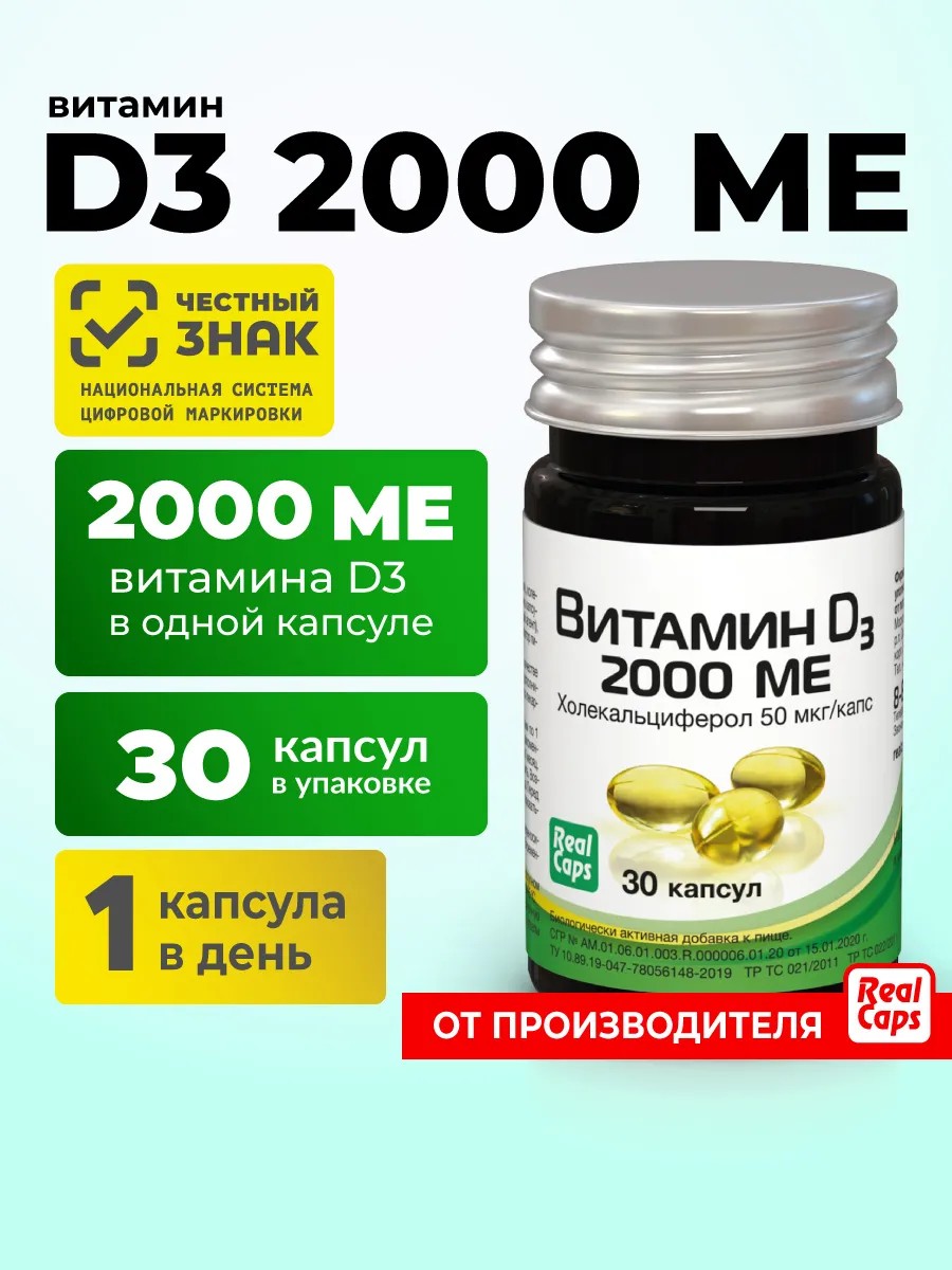 Витамин D3 RealCaps — высокоэффективный жирорастворимый витамин д 3 витамин капсулы, необходимый для полноценного функционирования организма. Каждая капсула содержит 2000 МЕ чистого холекальциферола (витамин д 2000ед), что обеспечивает оптимальную суточную норму.