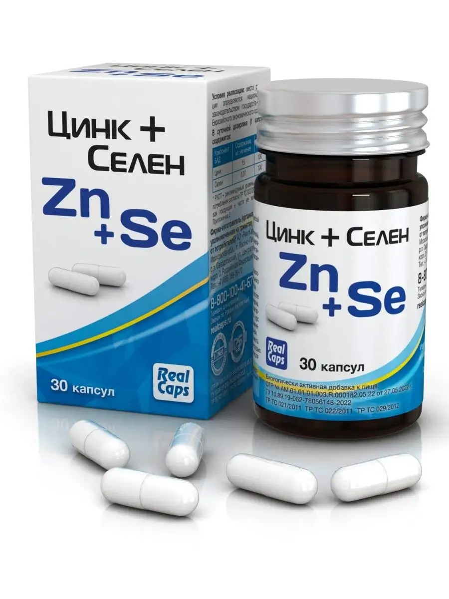 RealCaps Zinc+Selenium (Zn+Se) is an effective immunostimulant that significantly reduces the duration of colds. The components included in the dietary supplement "Zinc+Selenium (Zn+Se)" contribute to: 1. replenishing zinc and selenium deficiency in the body; 2. increasing the antioxidant protection of body cells; 3. protecting the body from the toxic effects of heavy metals; 4. normalizing the function of the thyroid gland and adrenal glands; 5. normalizing the acid-base balance; 6. increasing immunity (the body's defenses) during increased physical and mental stress, including during the "cold season"; 7. stabilizing metabolic processes in the body; 8. maintaining the reproductive function of men and women; 9. maintaining healthy skin, hair, nails; 10. Stabilization of the nervous and cardiovascular systems. Zinc deficiency leads to immunodeficiency and cognitive impairment, increased sensitivity to infectious agents, a higher incidence of dermatitis, and slower wound healing. In the elderly, zinc deficiency inhibits protein biosynthesis, leading to a decrease in muscle tissue and an increase in adipose tissue. Chronic zinc deficiency leads to the development or worsening of neurological and mental disorders, such as depression and schizophrenia, as well as neurodegenerative diseases, such as Alzheimer's, Parkinson's, and amyotrophic lateral sclerosis. Zinc helps reduce the risk of cancer. Adequate zinc intake promotes normal acid-base balance in the body. Selenium 1. neutralizes and removes heavy metals (lead, platinum, mercury) from the body, thereby helping the body cope with adverse environmental conditions; Helps protect cell membranes and body fats from peroxide radicals and hydrogen peroxide; 3. Provides protection for joints, retina, and blood vessels; 4. Together with vitamin E, helps maintain the health of the cardiovascular system; 5. Improves reproductive function in men and women. Directions: Adults take 1 capsule daily with meals or as directed by a physician. Duration of treatment: 1 month. Repeated doses are possible throughout the year. If necessary, the course of treatment can be repeated throughout the year. It is recommended to consult a physician before use. Not a medicine. Real Caps Zinc + Selenium (Zn + Se). RealCaps Zinc + Selenium (Zn + Se). Real Caps Zinc + Selenium (Zn + Se).