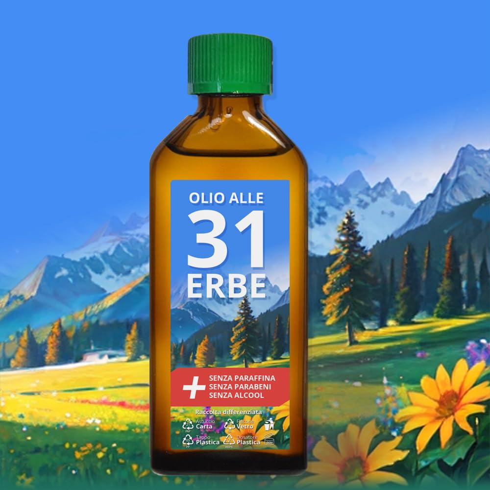 Keep this 31-herb oil on hand for: colds, headaches, backaches, abdominal cramps, stress, fatigue, dandruff, and wrinkles. It's also useful as an aftershave, a deodorizer for rooms, closets, or drawers, and an air purifier. Due to its cooling properties, it can be used to scent your home and diffused through radiators in winter. It can be applied to mosquito bites to relieve itching. Many men find it helpful as a natural aftershave, while women can experiment with it as an anti-wrinkle treatment. Add it to your detergents to better disinfect your home. It can be used as an expectorant simply by inhaling its aroma or by using it to make steam baths with hot water. Use it for relaxing massages on your entire body and head if you suffer from migraines. Its relaxing qualities can be enjoyed through massage or by adding a few drops to baths or foot soaks (this helps relieve stress and also provides a toning effect on the body and mind). It is a blend of pure essential oils extracted from medicinal plants such as mint, eucalyptus, orange, lemon, thyme, rosemary, lemon balm, lavender, and others, using leaves, berries, roots, or other parts depending on the plant. Rebeca Shop Oil 31 with dispenser.Huile 31 BALSAMICO aux 31 Herbes naturelles Raphreur ARTICOLAIRES 100 mlL'huile aux 31 herbes est à garder à portée de main en cas de : rhume, maux de tête, maux de dos, Crampes abdominales, Stress, fatigue, pellicules, rides, utile également comme : après-rasage. Désodorisant pour pièces, armoires ou tiroirs. Purificateur d'ambiance. En raison du pouvoir rafraîchissant, il peut être utilisé pour parfumer la maison et la diffuser par l'eau des radiateurs en hiver. Peut être appliqué sur les visées de moustiques pour soulager les démangeaisons. Beaucoup d'hommes le trouvent utile comme après-rasage naturel tandis que les femmes peuvent expérimenter comme anti-rides. Pour mieux désinfecter votre maison en l'ajoutant aux détergents. Peut être utilisé comme expectorant simplement en inhalant son arôme ou en utilisant pour faire des suffumoirs avec de l'eau chaude. Pour effectuer des massages relaxants sur tout le corps et la tête si vous souffrez de migraine. Ses qualités relaxantes peuvent être exploitées par massage ou en effectuant des bains ou des bains de pieds en diluant quelques gouttes dans l'eau (de cette façon on parvient à soulager le stress et on obtient également un effet tonifiant sur le corps et l'esprit). C'est un mélange d'huiles essentielles pures extraites de plantes officinales telles que la menthe, l'eucalyptus, l'orange, le citron, le thym, le romarin, la mélisse, la lavande et d'autres plantes, dont selon les cas on utilise des feuilles, des baies, des racines ou autres. Rebeca Shop Huile 31 avec compte-coge.