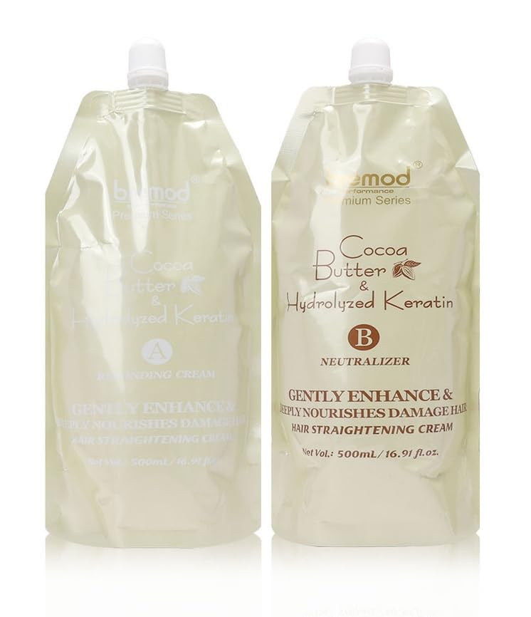 Product Features: This product is delicately infused with nourishing essence of cocoa butter seedand hydrolyzed keratin. lmmerse your hair in a luxurious blend designed to embrace simplicity and radiance. Bid farewell to dryness and unveil the beauty by making your hair radiate with a healthy shine and silky straight hair. Unlock the secret to vibrant, straight and healthy-looking hair. A set includes Softener and Rebonding Cream.