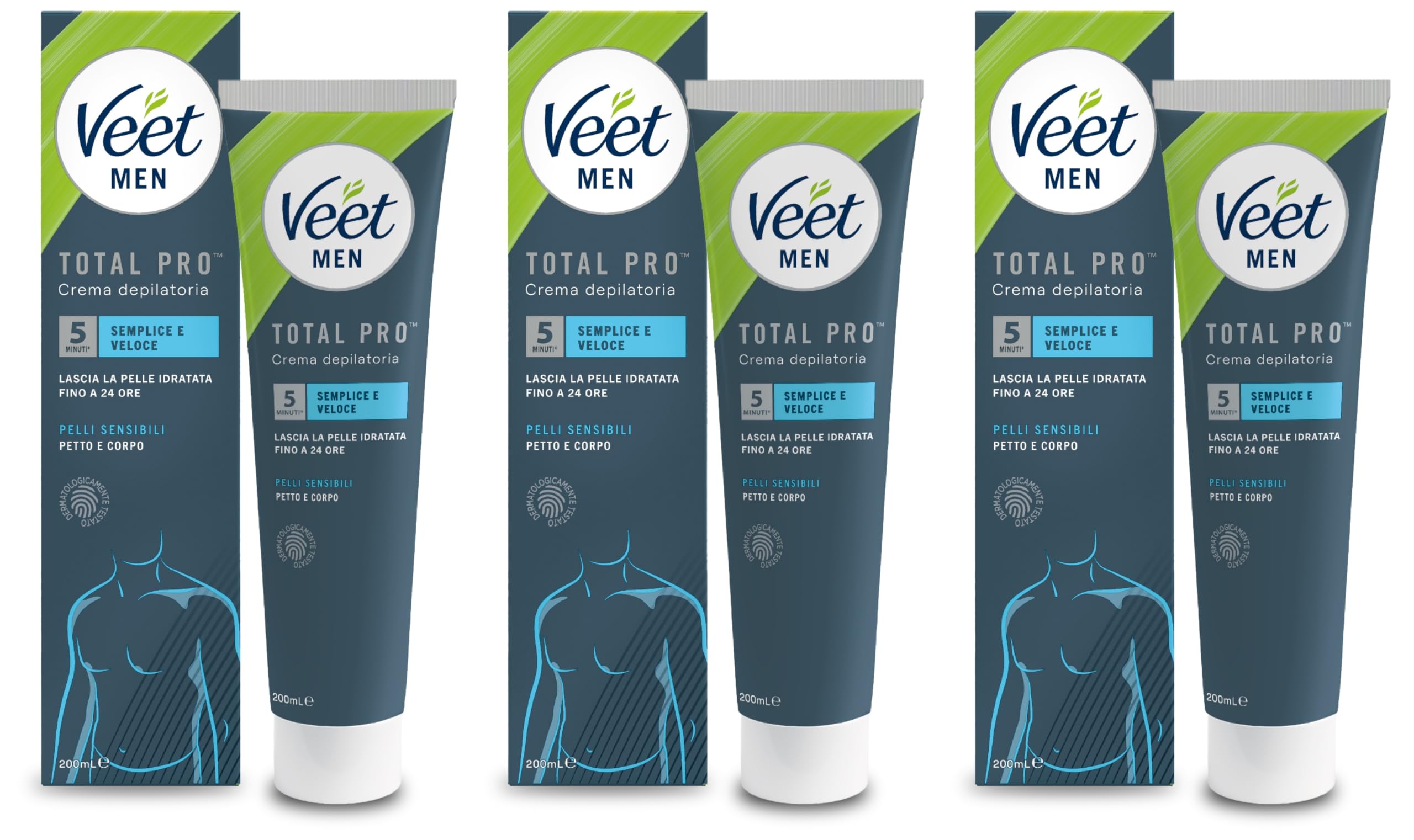INSTRUCTIONS FOR USE 1st Make sure your skin is dry before use. 2nd Apply the cream to the area you want to epilate. 3rd Let the cream work for 5-10 minutes. 4 pieces. Rinse the cream and remove the hair. Avoid use on damaged or irritated skin. SAFETY WARNING [IMPLIED] Read and follow all safety instructions on the package thoroughly.Think for the most sensitive skin: our hair removal cream has been dermatologically tested and the formula has been specially developed for sensitive skin. Smooth skin for up to 7 days: Effectively removes even the shortest hairs and leaves your skin smooth for up to 7 days. Up to 24 hours of moisture: the VEET cream hydrates your skin and thanks to its formula guarantees the absence of persistent bad odors. Fast and painless: the VEET hair removal cream works in just a few minutes. Simply apply, leave on for 5-10 minutes and then rinse. For skin and men: try the VEET Men cream, which has been developed to quickly and effectively remove hair from the chest, abdomen, shoulders, back, arms, armpits and legs.Veet Total Pro Ontharingscrème voor mannen voor borst en lichaam, voor de gevoelige huid (klassieke ontharing, 3 verpakkingen à 200 ml) GEBRUIKSAANWIJZING 1e Zorg ervoor dat je huid voor gebruik droog is. 2e Breng de crème aan op het gebied dat je wilt epileren. 3e Laat de crème 5-10 minuten inwerken. 4 stuks. Spoel de crème uit en verwijder het haar. Vermijd het gebruik op beschadigde of geïrriteerde huid. VEILIGHEIDSWAARSCHUWING [IMPLICIED] Lees en volg alle veiligheidsinstructies op de verpakking grondig.Denk voor de meest gevoelige huid: onze ontharingscrème is dermatologisch getest en de formule is speciaal ontwikkeld voor de gevoelige huid. Gladde huid tot 7 dagen: verwijdert effectief zelfs de kortste haren en laat je huid tot 7 dagen glad achter. Tot 24 uur vochtigheid: de VEET crème hydrateert je huid en dankzij de formule garandeert de afwezigheid van aanhoudende slechte geurtjes. Snelle werking en pijnloos: de VEET ontharingscrème werkt in enkele minuten. Gewoon aanbrengen, 5-10 minuten laten inwerken en vervolgens uitspoelen. Voor huid en mannen: probeer de crème VEET Men uit, die is ontwikkeld om borst, buik, schouders, rug, armen, oksels en benen snel en effectief te ontharen.