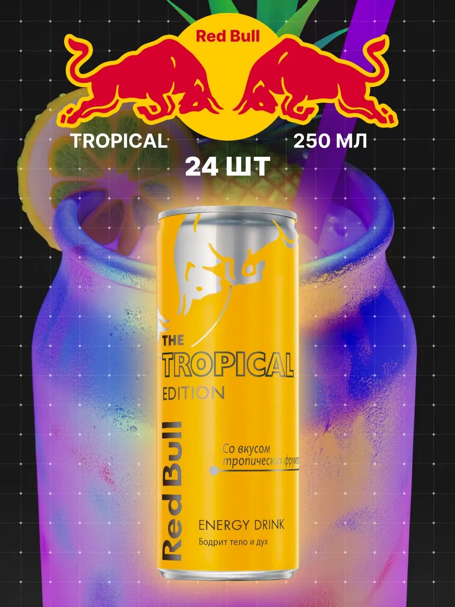 Tropical Red Bull will keep you energized for a long time and give you an unforgettable feeling of fresh tropical fruit on a sunny day thanks to its unique composition.