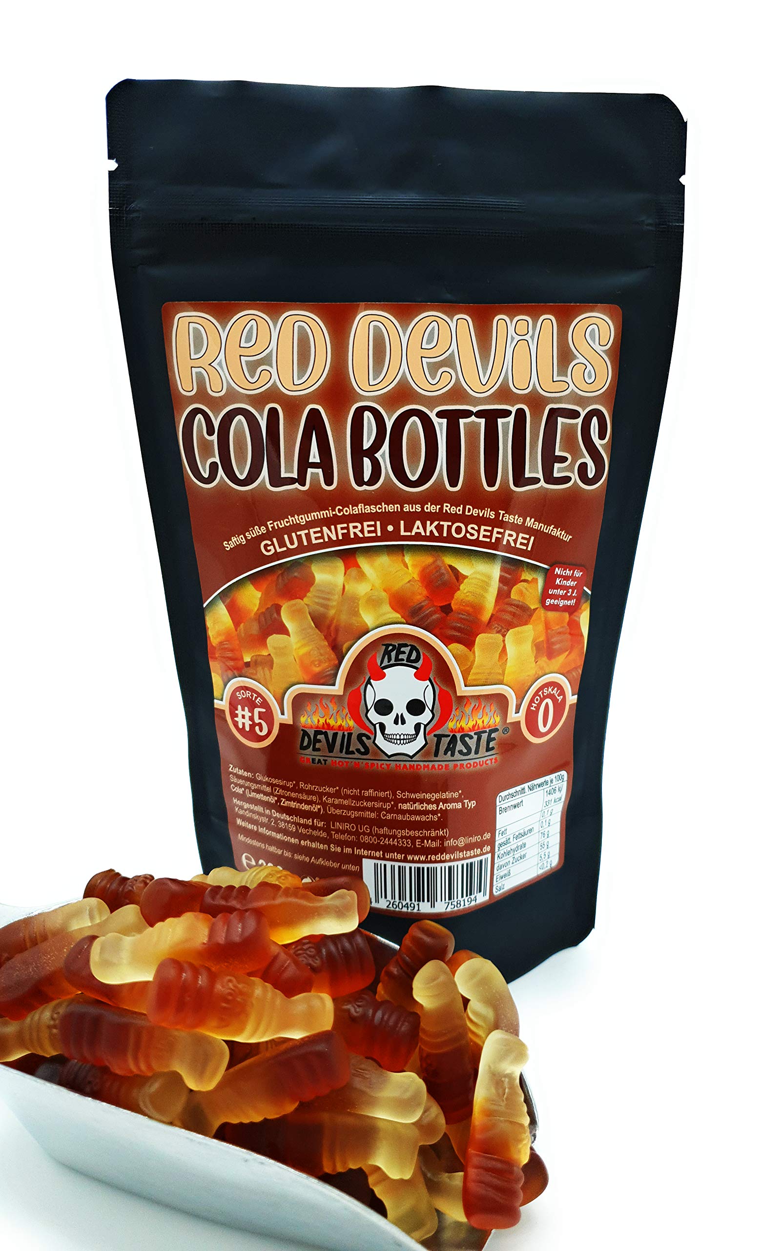 200g Cola Bottles – Perfect for fruit lovers. If cola is your thing when combined with a healthy snack, then you've come to the right place: our factory is a true paradise for discerning sweet tooths. The short history of fruit candies began its success story in Germany in 1920. Due to a lack of resources, the recipe for making fruit candies was invented. The candy became famous and is considered one of the most extraordinary sweets in the world. But like other classics, tastes and preferences change over time. The new generation of fruit candies today is trending towards balanced, healthy, and natural products with a short ingredient list. At Red Devils Button, we have taken up this challenge. The added value of our fruit gum product lies in the fact that traditional ingredients are replaced with healthy, naturally sourced ingredients, without compromising the taste experience. The recipe uses only premium sugar, and thanks to the exclusive ingredients, our cola bottles are guaranteed gluten-free and lactose-free. Beyond the classic bottle appearance and typical cola aroma, these little fruit cola bottles offer a delicious taste, an optimal texture, and a super smooth mouthfeel. From the moment you open the bag, the delightful aromas unfold, and with the first bite, you'll taste an extra dose of flavorful cola. Try it for yourself and you'll be delighted with our lovely lifestyle product. The cola bottles come in attractive 200g packs. They make a great gift for cola lovers aged 3 and up. Tip: You can use these little cola bottles to beautifully decorate your cakes and desserts! INGREDIENTS glucose syrup, cane sugar (unrefined), pork gelatin, acidifier (citric acid), caramel sugar syrup, natural cola-type flavoring (lime oil, cinnamon bark oil) - Glazing agent: carnauba waxRed Devils Cola BOTTLES – 200 g – Dans un sachet refermableDESCRIPTION DU PRODUIT DESCRIPTION DU PRODUIT Bouteilles de cola de 200 g – Parfait pour les gourmands de fruits. Si le cola est votre truc en combinaison avec une collation saine, alors vous êtes au bon endroit : notre manufacture est un véritable paradis pour les gourmands exigeants. La brève histoire des bonbons aux fruits a commencé l'histoire du succès en Allemagne en 1920. Par manque de ressources, la recette pour la fabrication de bonbons aux fruits a été inventée. Le bonbon est devenu célèbre et compte parmi les bonbons les plus extraordinaires au monde. Mais comme d'autres classiques, les exigences et le goût changent avec le temps. La nouvelle génération de bonbons aux fruits est aujourd'hui la tendance à des produits équilibrés, sains et naturels avec une courte liste d'ingrédients. Chez Red Devils Button, nous avons relevé ce défi. La valeur ajoutée de notre produit à base de gommes aux fruits réside dans le fait que les ingrédients classiques sont remplacés par des ingrédients sains d'origine naturelle, sans compromettre l'expérience gustative. La recette utilise uniquement du sucre de qualité supérieure et, grâce aux ingrédients exclusifs, nos bouteilles de cola sont garanties sans gluten et sans lactose. Ainsi, les petites bouteilles de cola aux fruits ont un goût en plus de l'aspect classique de la bouteille et du parfum typique de cola, notre produit convainc par une texture optimale et une sensation de bouche super douce. Dès l'ouverture du sachet, les délicieux arômes se déploient et à la première bouchée, vous goûtez la portion supplémentaire aromatique de cola. Testez vous-même et vous serez ravi de notre joli produit Lifestyle. Les bouteilles de cola sont présentées dans un joli emballage de 200 g. Ils sont un excellent cadeau pour les amateurs de cola à partir de 3 ans. Astuce : avec les petites bouteilles de cola, vous pouvez décorer joliment vos tartes et desserts ! INGRÉDIENTS sirop de glucose, sucre de canne (non raffiné), gélatine de porc, acidifiant (acide citrique), sirop de sucre de caramel, arôme naturel de type cola (huile de citron vert, huile d'écorce de cannelle) - Agent d'enrobage : cire de carnauba