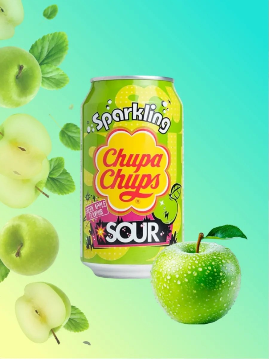 Напиток газированный со вкусом зеленого яблока Chupa Chups.