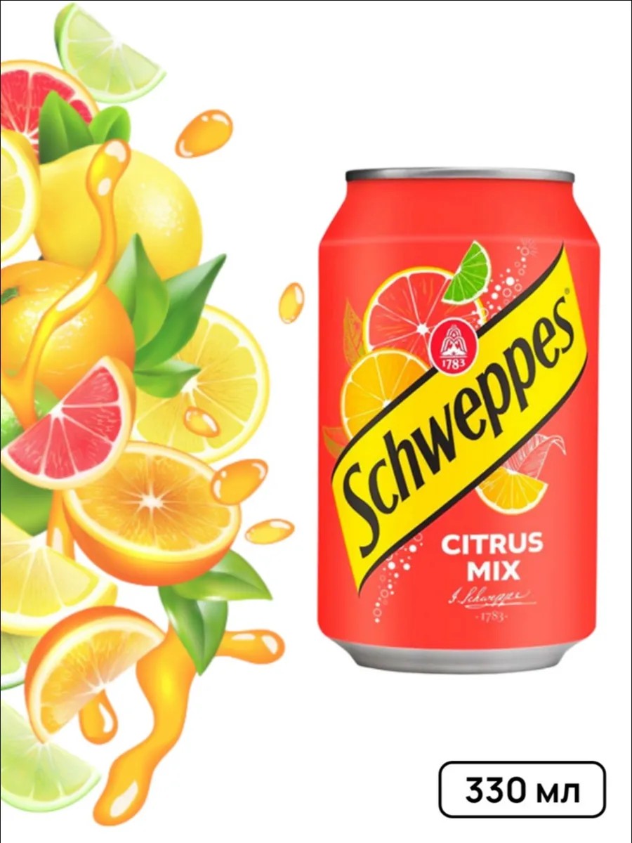 Газированный напиток Schweppes со вкусом микса цитрусовых. Освежающий лимонад с ярким вкусом апельсина, мандарина, грейпфрута и лайма.