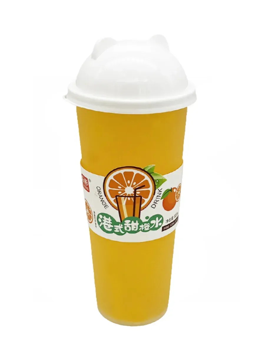 Напиток с соком апельсина и желе. Сладкий освежающий напиток в большом удобном стакане.