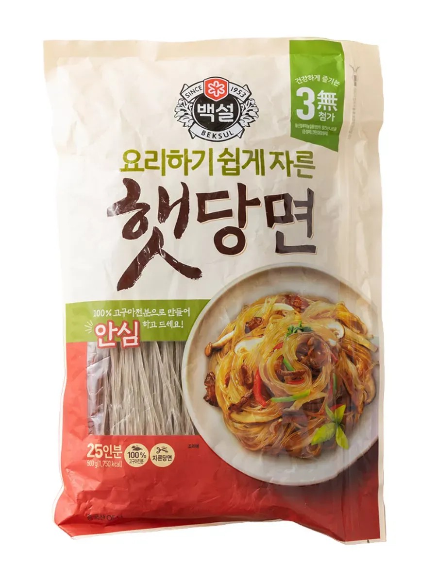 Картофельная лапша для чапче. Лапшу жарят с овощами, мясом и грибами в кунжутном масле, затем заправляют соевым соусом и посыпают семенами кунжута. Идеально подходит всем любителям корейской кухни, так как с ней можно приготовить классическое блюдо с говядиной, овощами и грибами - Чапчхе.