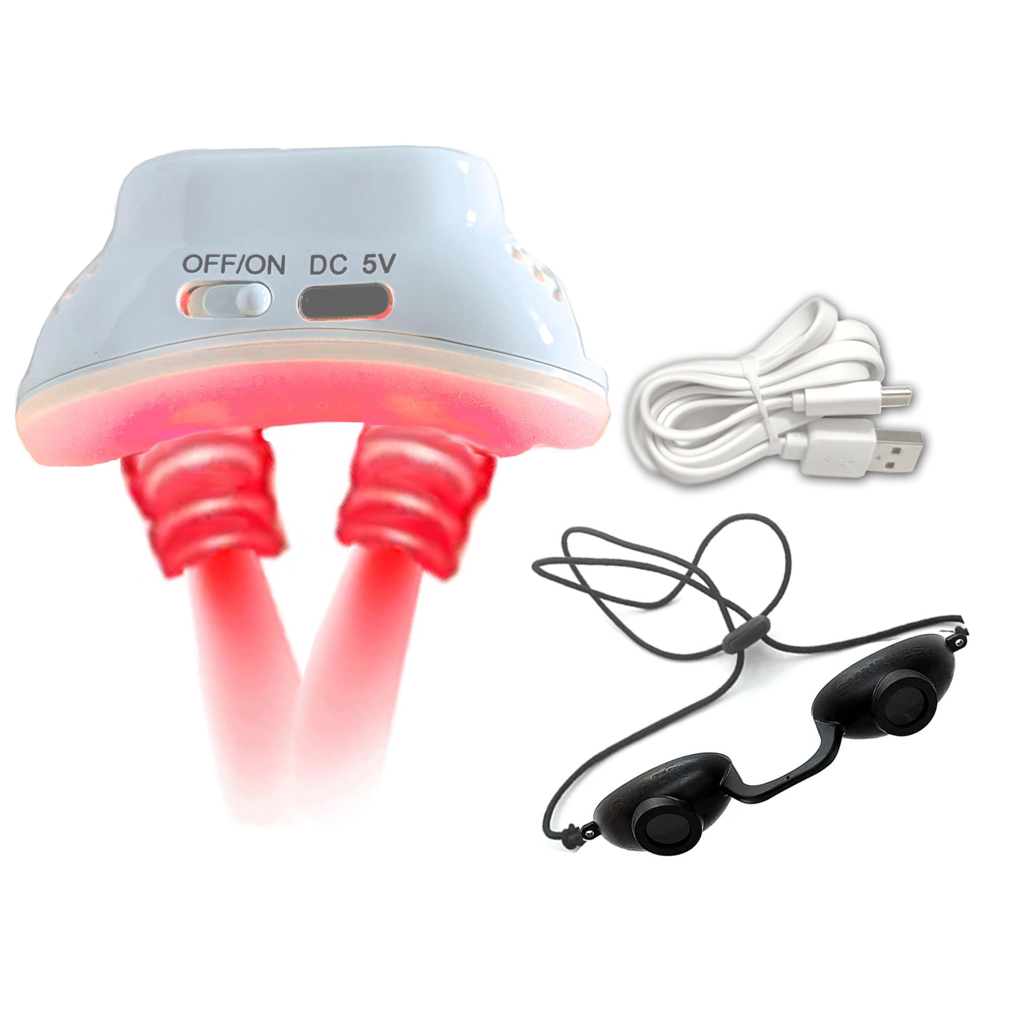 Red light nasal stimulator with USB charger and eye protection.