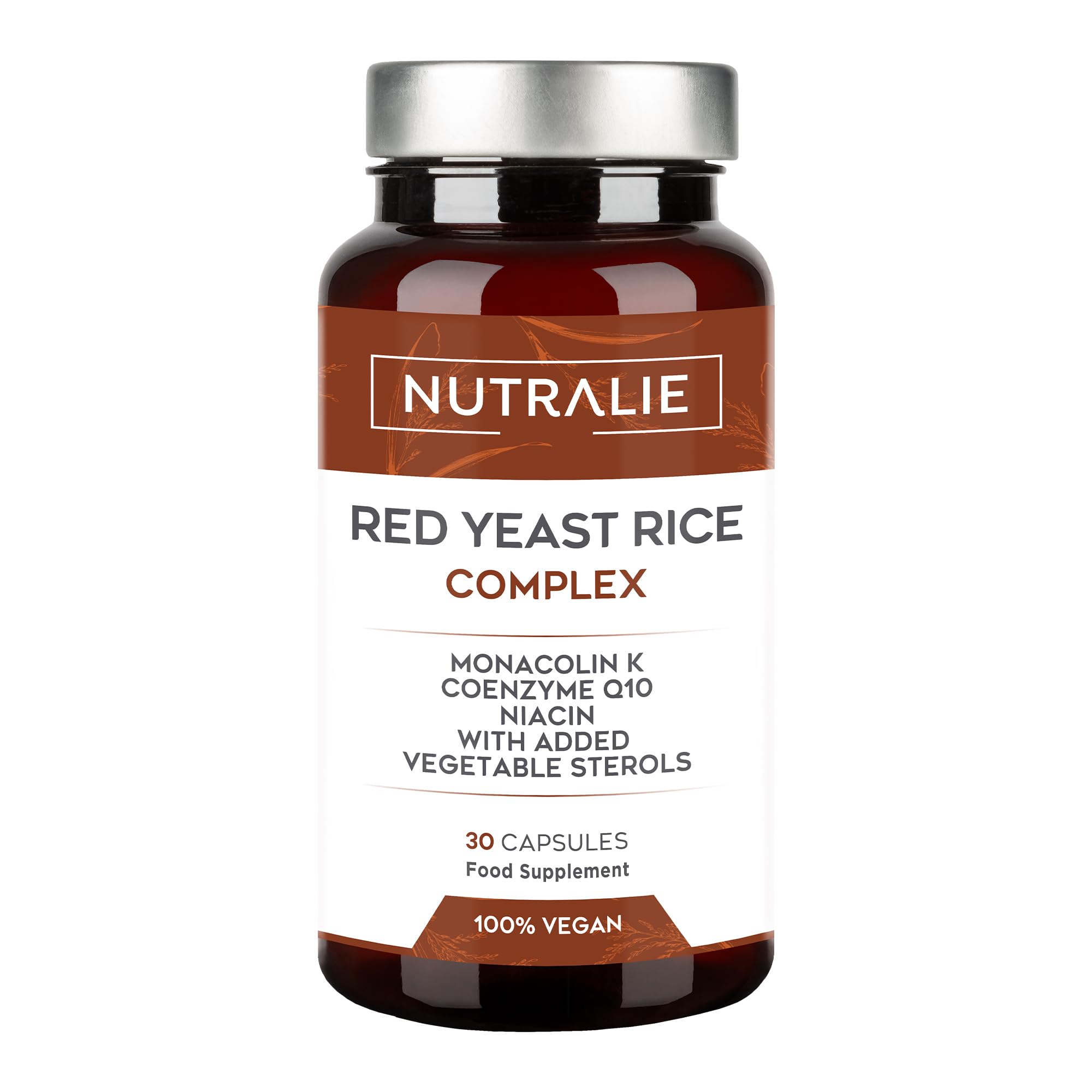 ORGANIC RED YEAST RICE: Our Red Yeast Rice Complex contains 2.9 mg of Monacoline K and 30 mg of Coenzyme Q10 for 1 capsule. INGREDIENTS dry extract of sage leaves and stems (Salvia officinalis L.), vegetable capsule: glazing agent (hydroxypropyl methylcellulose), plant sterols (from soybean oil, 12820.5 mg 100 g), dry extract of garlic bulb (Allium sativum L.), L-ascorbic acid (vitamin C), red yeast rice (Monascus purpureus), bulking agent (cellulose microcrystalline), coenzyme Q10 (ubiquinone), DL-alpha-tocopheryl acetate (vitamin E), dry extract of sugar cane sap (Saccharum officinarum L.), calcium D-pantothenate (pantothenic acid-vitamin B5), nicotinamide (niacin - vitamin B3), anti-caking agents (magnesium salts of fatty acids, silicon dioxide). DIRECTIONS FOR USE 1 capsule per day to take with water. SAFETY WARNING Food supplements should not replace a varied and balanced diet and a healthy lifestyle. Do not exceed the expressly recommended daily dose. Keep out of reach of young children. Food supplement intended exclusively for people who wish to reduce their blood cholesterol levels. Avoid consuming more than 3 g day of added plant sterols or stanols. Consult your doctor if you are taking treatment to lower cholesterol. This food supplement should be used as part of a balanced and varied diet including regular consumption of fruits and vegetables to help maintain carotenoid levels. The daily dose of 3 mg of red yeast rice monacolins or more should not be consumed. Should not be consumed by pregnant or lactating women, children under 18 years of age and adults over 70 years of age. If you have any health problems, seek advice from your doctor before consuming this product. Should not be consumed if you are taking medication to lower your cholesterol levels. Should not be consumed if you are already taking other products containing red yeast rice. Not recommended for people on anticoagulant or anti-retroviral treatment (saquinavir, ritonavir, etc.) or for women with a personal history of breast cancer. Store the container tightly closed in a cool, dry place. ? NUTRALIE QUALITY: Nutralie food supplements are developed according to a rigorous protocol. The ingredients are selected according to the strictest quality controls. 30 VEGETABLE CAPSULES: Nutralie Red Yeast Rice Complex comes in a container of 90 100 vegan capsules. The formula of our red yeast rice supplement does not contain lactose or gluten. ? COENZYME Q10 30 MG VITAMIN C, E, B3: Our formula combines red yeast rice extracts with Monacolin K and Coenzyme Q10 with active ingredients such as vitamin C, E, B3, astragalus roots and natural extracts of sage, garlic and sugar cane. Vitamin B3 contributes to normal energy-yielding metabolism and helps reduce tiredness and fatigue (EFSA). MONACOLIN K DOSED AT 2.9 MG: Nutralie Red Yeast Rice contains a high dose of Monacolin K (2.9 mg) and coenzyme Q10 (30 mg). Monacolin K from red yeast rice contributes to the maintenance of normal cholesterol levels (EFSA). BIO-AVAILABLE RED YEAST RICE: Our Red Yeast Rice Complex contains 2.9 mg of Monacolin K and 30 mg of Coenzyme Q10 per 1 capsule. LEVURE DE RIZ ROUGE BIO-DISPONIBLE: Notre Complexe Levure de Riz Rouge contient 2,9mg de Monacoline K et 30 mg de Coenzyme Q10 pour 1 capsule. INGRÉDIENTS extrait sec de feuilles et de tiges de sauge (Salvia officinalis L.), gélule végétale : agent d'enrobage (hydroxypropylméthylcellulose), stérols végétaux (à partir d'huile de soja, 12820,5 mg 100 g), extrait sec de bulbe d'ail ( Allium sativum L.), acide L-ascorbique (vitamine C), levure de riz rouge (Monascus purpureus), agent de charge (cellulose microcristalline), coenzyme Q10 (ubiquinone), acétate de DL-alpha-tocophéryle (vitamine E), extrait sec de sève de canne à sucre (Saccharum officinarum L.), calcium D-pantothénate (acide pantothénique-vitamine B5), nicotinamide (niacine - vitamine B3), antiagglomérants (sels de magnésium d'acides gras, dioxyde de silicium). MODE D'EMPLOI 1 gélule par jour à prendre avec de l'eau. AVERTISSEMENT DE SÛRETÉ Les compléments alimentaires ne doivent pas se substituer à une alimentation variée et équilibrée et à un mode de vie sain. Ne pas dépasser la dose journalière expressément recommandée. Tenir hors de la portée des jeunes enfants. Complément alimentaire destiné exclusivement aux personnes qui souhaitent réduire leur taux de cholestérol sanguin. Évitez de consommer plus de 3 g jour de stérols ou de stanols végétaux ajoutés. Consultez votre médecin si vous êtes sous traitement pour réduire le cholestérol. Ce complément alimentaire doit être utilisé dans le cadre d'une alimentation équilibrée et variée comprenant une consommation régulière de fruits et légumes pour aider à maintenir les niveaux de caroténoïdes. La dose journalière de 3 mg de monacolines de la levure de riz rouge ou plus ne doit pas être consommée. Ne doit pas être consommé par les femmes enceintes ou allaitantes, les enfants de moins de 18 ans et les adultes de plus de 70 ans.Si vous avez des problèmes de santé, demandez conseil à votre médecin avant de consommer ce produit. Ne doit pas être consommé si vous prenez un médicament pour faire baisser votre taux de cholestérol. Ne doit pas être consommé si vous prenez déjà d'autres produits contenant de la levure de riz rouge. Déconseillé aux personnes sous traitement anticoagulant, anti-rétroviral (saquinavir, ritonavir.) ou aux femmes ayant des antécédents personnels de cancer du sein. Conservez le récipient hermétiquement fermé dans un endroit frais et sec. ? QUALITÉ NUTRALIE: Les compléments alimentaires de Nutralie sont élaborés selon un protocole rigoureux. Les ingrédients sont sélectionnés selon les contrôles de qualité les plus stricts. 30 GÉLULES VÉGÉTALES: Le Complexe de levure de riz rouge Nutralie est présenté dans un contenant de 90 gélules 100 vegan. La formule de notre complément de le