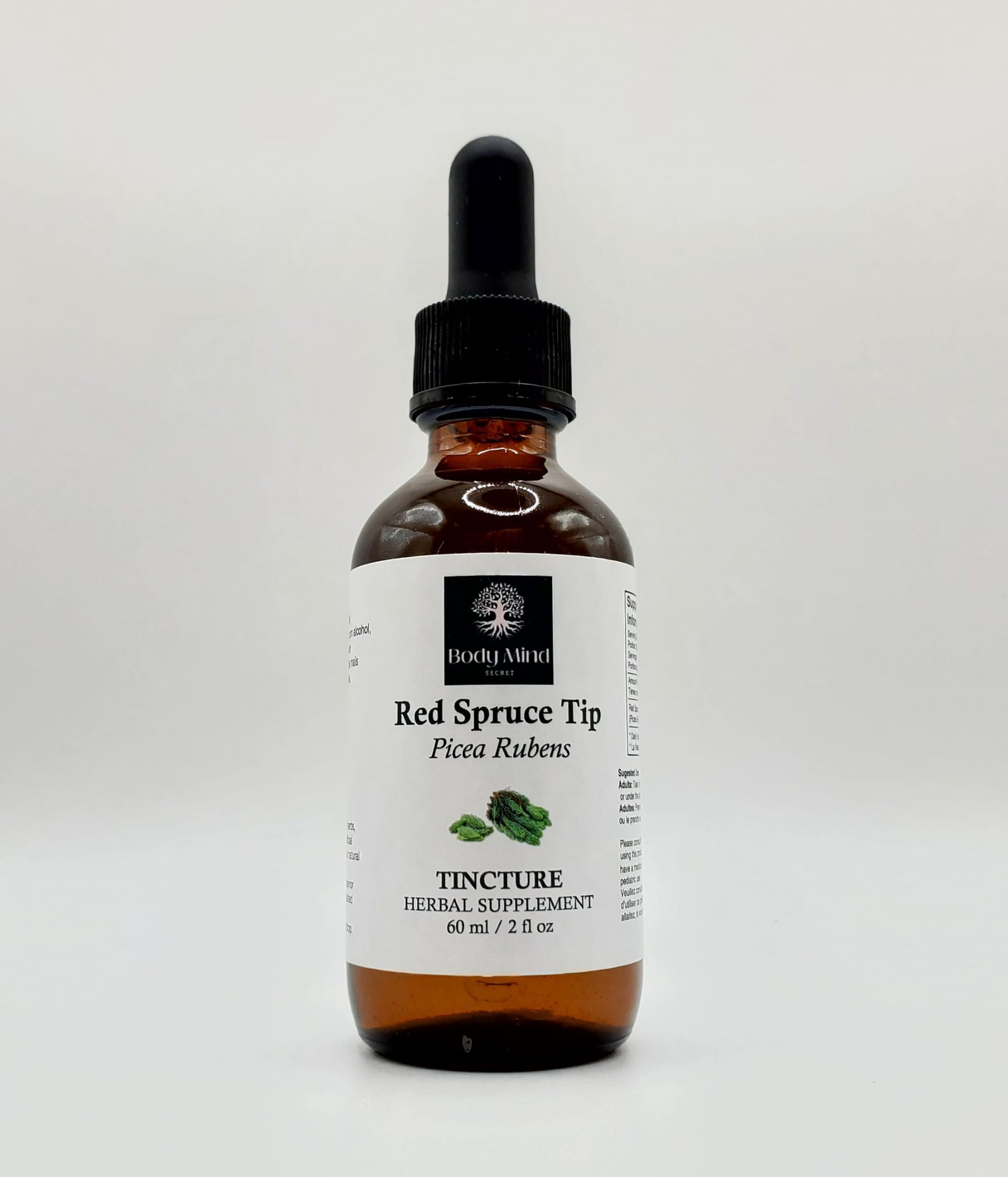 Our red spruce tincture, crafted from the finest wild-harvested spruce tips, is a powerful natural remedy. Known for its anti-inflammatory properties, it supports respiratory health, boosts the immune system, and aids in relieving muscle aches. Embrace the healing power of nature with our red spruce tincture. Please consult your healthcare provider before taking.Red Spruce Tip - Tincture: anti-inflammatory properties it supports respiratory health boosts the immune system aids in relieving muscle aches.