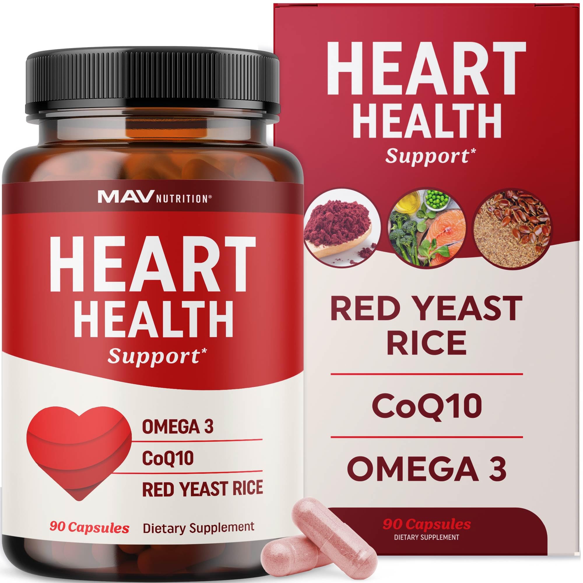 THIRD-PARTY TESTED: MAV Nutrition's Healthy Heart Support plus CoQ10 Omega 3 is formulated Gluten-Free, Vegan, Non-GMO, and free of the Top 9 Allergens. All of our supplements are Third-Party Tested to ensure the highest quality standards. WITH ADDED OMEGA-3: Enhanced with plant-based flaxseed oil powder, this complex provides ALA, one of the essential Omega3 fatty acids that your body needs to support healthy cardiovascular, circulatory, and muscle function. . HEALTHY CHOLESTEROL SUPPORT: Monacolin K, the active compound in Red Yeast Rice, is valued for its ability to support healthy cholesterol. Red Yeast Rice with Monacolin K helps to maintain cholesterol levels that are already within the normal range. . HEART SMART FORMULA: Our cardiovascular supplement contains heart healthy ingredients like Co Q 10, a powerful antioxidant. Red Rice Yeast with CoQ10 supports your body's ability to generate energy and fight oxidative stress. . EXTRA STRENGTH RED YEAST RICE: Red Rice Yeast has been used for centuries in Asia to support cardiovascular health. Our Red Yeast Rice supplement delivers a potent 1200 mg of Red Yeast Rice powder per serving.