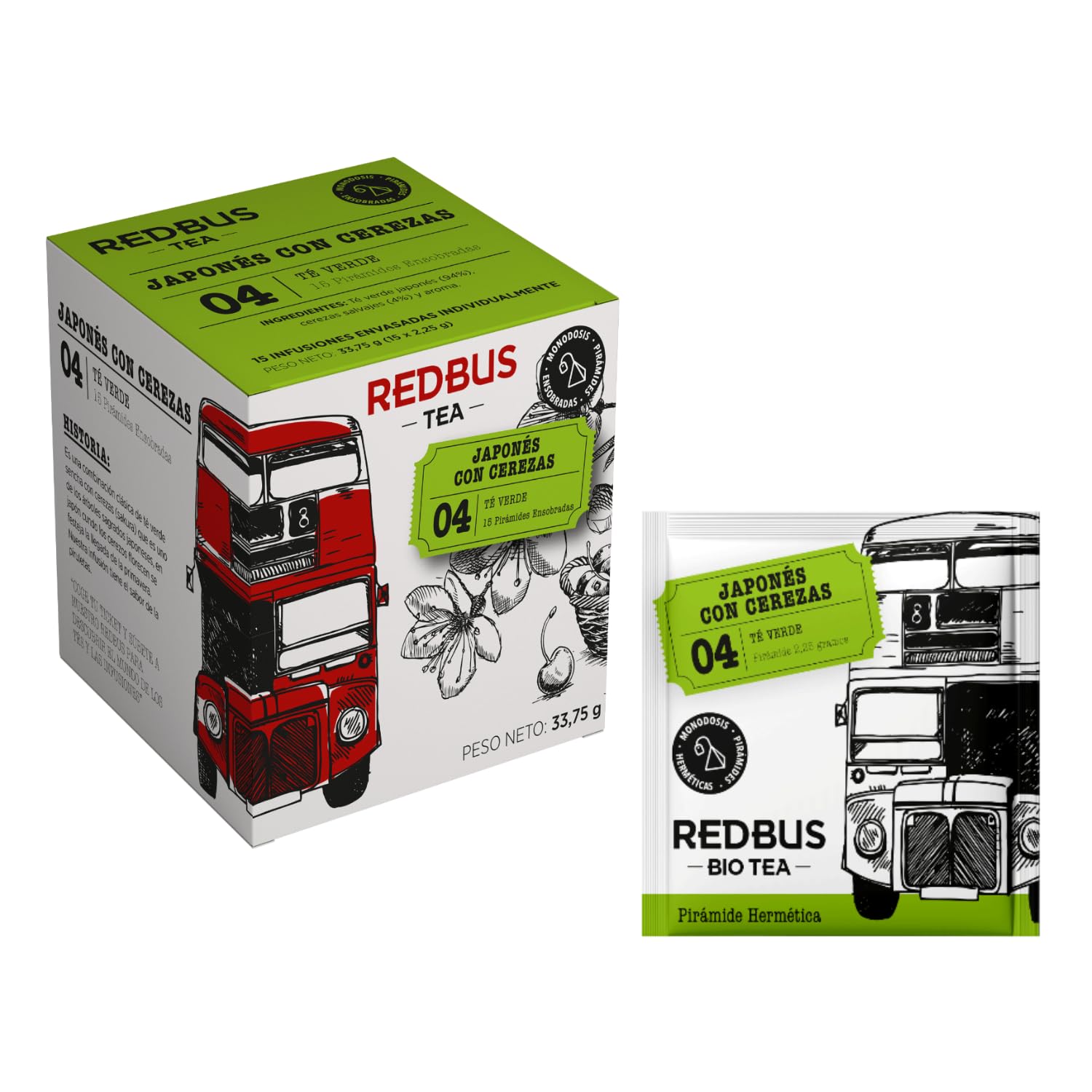REDBUS TEA Embark on REDBUS to discover the world of tea! Hop aboard the REDBUS and enjoy a delightful journey. The itinerary includes stops in exotic and relaxing destinations, classic landmarks, and places where nature still reigns supreme. The flavors and aromas of the teas and infusions range from classic black tea with a strong and full-bodied taste, to fermented teas with leaves dried directly in the open air, from red teas to Japanese and Chinese green teas, to caffeine-free rooibos, and herbal teas made with natural fruits and berries. "Japonés con Cerezas": a blend of Japanese Sencha green tea with a cherry flavor (Sencha Sakura) in individually wrapped pyramid filters (15 filters - 33.75 grams). Packed in Spain. [THE JOURNEY] - Embark on REDBUS to discover the world of tea! Hop aboard the REDBUS and enjoy a delightful journey. The route includes stops at exotic and relaxing destinations, classic landmarks, and places where nature still reigns supreme. You can enjoy a variety of blends perfect for any time of day! [PYRAMID INFUSER] - Boxes with single-use pyramid infusers wrapped in 100 compostable, plastic-free paper. The infusers are presented in individual sachets that preserve the aroma of the product. Each flavor is thus perfectly distinct. [THE FLAVORS OF THE RANGE] - The flavors and aromas of the teas and infusions range from classic black tea with a strong and full-bodied taste, to fermented tea with leaves dried directly in the open air, red teas, Japanese and Chinese green teas, caffeine-free rooibos, and finally, herbal teas made with natural fruits and berries. [SENCHA SAKURA] - A classic combination of sencha green tea with cherry blossoms (sakura), one of Japan's sacred trees. In Japan, spring is celebrated when the cherry trees bloom. The infusion has a. INGREDIENTS Japanese green tea 94 , cherry flavoring 4 , flavorings. INSTRUCTIONS Infuse for 2 to 3 minutes at a temperature of 90 C (194 F). SAFETY WARNING Contains caffeine. Not recommended for children or pregnant women. See moreRedbus Thé vert cerise japonais Pyramides de Thé Vert Sencha Filtres japonais Sencha Sakura emballés individuellement - 15 pyramides de thé (33,75 gr)DESCRIPTION DU PRODUIT DESCRIPTION DU PRODUIT REDBUS TEA Embarquez sur REDBUS pour découvrir le monde du thé ! Montez à bord du REDBUS et profitez d'un délicieux voyage. L'itinéraire comprend des arrêts dans des destinations exotiques et relaxantes, des monuments classiques et des lieux où la nature règne encore. Les saveurs et les arômes des thés et infusions vont du thé noir classique au goût fort et consistant, au thé fermenté avec des feuilles séchées directement à l'air libre, des thés rouges aux verts japonais et chinois, au rooibos sans caféine, en passant par avec des tisanes à base de fruits naturels et de baies. "Japonés con Cerezas": mélange de thé vert japonais Sencha au goût de cerise (Sencha Sakura) dans des filtres pyramidaux emballés individuellement (15 filtres - 33,75 grammes). Emballé en Espagne. [LE VOYAGE] - Embarquez sur REDBUS pour découvrir l'univers du thé ! Montez à bord du REDBUS et profitez d'un délicieux voyage. L'itinéraire comprend des arrêts dans des destinations exotiques et relaxantes, des monuments classiques et des lieux où la nature règne encore. Vous pouvez profiter de nombreux mélanges adaptés à tout moment de la journée ! [INFUSEURS PYRAMIDES] - Boîtes avec infuseurs pyramidaux unidoses emballés dans du papier 100 compostable sans plastique. Les infuseurs sont présentés dans des sachets individuels qui préservent l'arôme du produit. Chaque saveur est ainsi parfaitement distinguée. [LES SAVEURS DE LA GAMME] - Les saveurs et arômes des thés et infusions vont du thé noir classique au goût puissant et consistant, au thé fermenté avec des feuilles séchées directement à l'air libre, des thés rouges, aux japonais et chinois verts, avec du rooibos sans caféine pour finir avec des tisanes à base de fruits et de baies naturels. [SENCHA SAKURA] - Une combinaison classique de thé vert sencha avec des cerises (sakura) qui est l'un des arbres sacrés japonais. Au Japon, le printemps est célébré lorsque les cerisiers sont en fleurs. L'infusion a un go. INGRÉDIENTS Thé vert japonais 94 , arôme cerise 4 , arômes. MODE D'EMPLOI Infusion pendant 2 à 3 minutes à une température de 90 C AVERTISSEMENT DE SÉCURITÉ Contient de la caféine Non recommandé pour les enfants ou les femmes enceintes. Voir plus