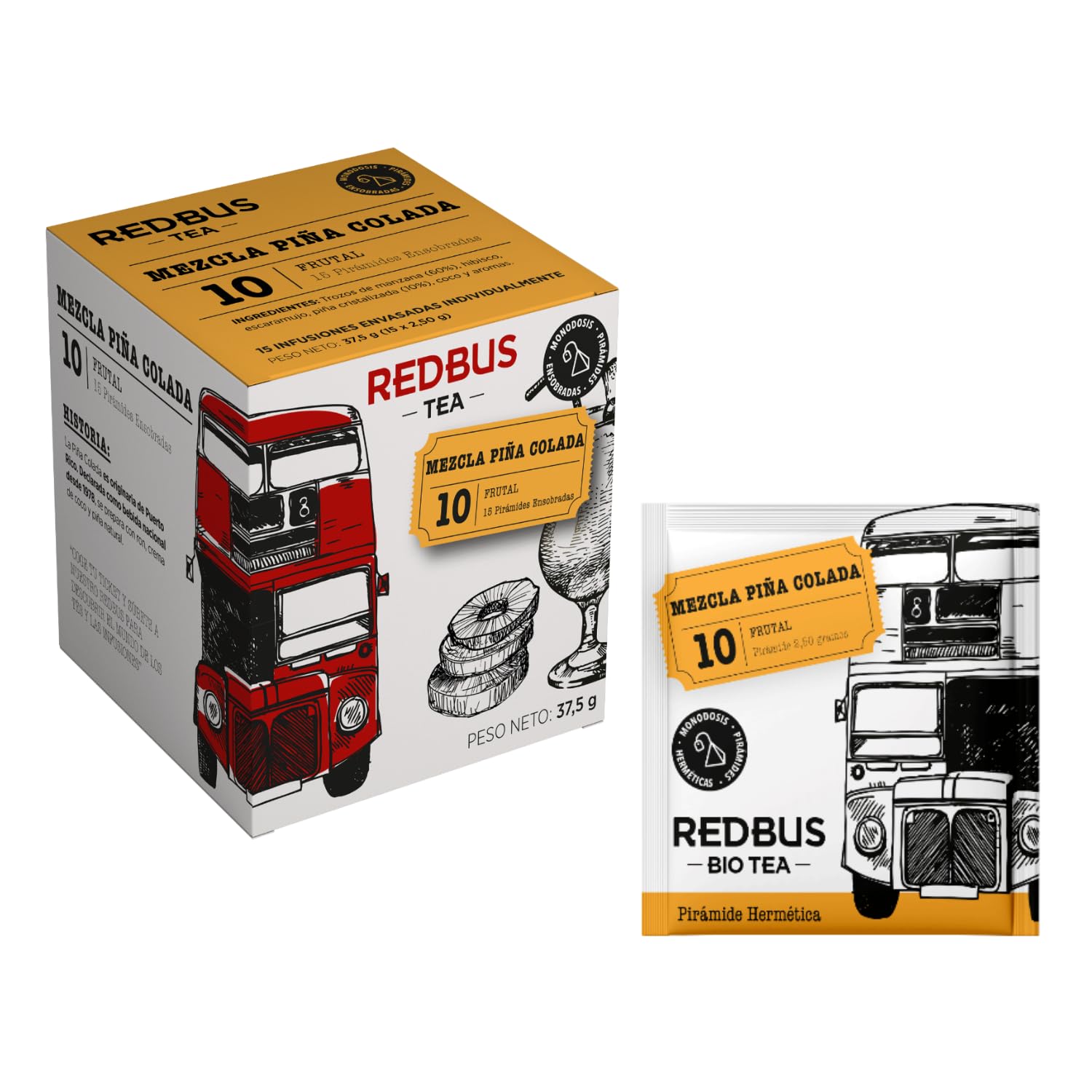 REDBUS TEA Embark on REDBUS to discover the world of tea! Hop aboard the REDBUS and enjoy a delightful journey. The itinerary includes stops in exotic and relaxing destinations, classic monuments, and places where nature still reigns supreme. The flavors and aromas of the teas and infusions range from classic black tea with a strong and full-bodied taste, to fermented tea with leaves dried directly in the open air, from red teas to Japanese and Chinese green teas, to caffeine-free rooibos, and herbal teas made with natural fruits and berries. "Piña Colada": a fruity infusion made with pineapple, apple, hibiscus, coconut, and rosehip, caffeine-free, in individually wrapped pyramid filters (15 filters - 30 grams). Packaged in Spain. [THE JOURNEY] - Embark on REDBUS to discover the world of tea! Hop aboard the REDBUS and enjoy a delightful journey. The route includes stops at exotic and relaxing destinations, classic landmarks, and places where nature still reigns supreme. You can enjoy a variety of blends perfect for any time of day! [PYRAMID INFUSER] - Boxes with single-use pyramid infusers wrapped in 100 compostable, plastic-free paper. The infusers are presented in individual sachets that preserve the aroma of the product. Each flavor is thus perfectly distinct. [THE FLAVORS OF THE RANGE] - The flavors and aromas of the teas and infusions range from classic black tea with a strong and full-bodied taste, to fermented tea with leaves dried directly in the open air, red teas, Japanese and Chinese green teas, caffeine-free rooibos, and finally, herbal teas made with natural fruits and berries. [PINA COLADA] - The Piña Colada originated in Puerto Rico. It was declared the national drink in 1978. The infusion offered here is a blend of pineapple, coconut, hibiscus flowers, apple. INGREDIENTS Apple pieces 60 , hibiscus, rosehip, candied pineapple, coconut, flavoring.Redbus Infusion Piña Colada Tisane Ananas et Fruits Infusion Fruitée Piña Colada Filtres Emballés Individuellement - 15 Pyramides (30 Gr)DESCRIPTION DU PRODUIT DESCRIPTION DU PRODUIT REDBUS TEA Embarquez sur REDBUS pour découvrir le monde du thé ! Montez à bord du REDBUS et profitez d'un délicieux voyage. L'itinéraire comprend des arrêts dans des destinations exotiques et relaxantes, des monuments classiques et des lieux où la nature règne encore. Les saveurs et les arômes des thés et infusions vont du thé noir classique au goût fort et consistant, au thé fermenté avec des feuilles séchées directement à l'air libre, des thés rouges aux verts japonais et chinois, au rooibos sans caféine, en passant par avec des tisanes à base de fruits naturels et de baies. "Piña Colada": infusion fruitée à base d'ananas, avec pomme, hibiscus, noix de coco et églantier, sans caféine, dans des filtres pyramidaux emballés individuellement (15 filtres - 30 grammes). Emballé en Espagne. [LE VOYAGE] - Embarquez sur REDBUS pour découvrir l'univers du thé ! Montez à bord du REDBUS et profitez d'un délicieux voyage. L'itinéraire comprend des arrêts dans des destinations exotiques et relaxantes, des monuments classiques et des lieux où la nature règne encore. Vous pouvez profiter de nombreux mélanges adaptés à tout moment de la journée ! [INFUSEURS PYRAMIDES] - Boîtes avec infuseurs pyramidaux unidoses emballés dans du papier 100 compostable sans plastique. Les infuseurs sont présentés dans des sachets individuels qui préservent l'arôme du produit. Chaque saveur est ainsi parfaitement distinguée. [LES SAVEURS DE LA GAMME] - Les saveurs et arômes des thés et infusions vont du thé noir classique au goût puissant et consistant, au thé fermenté avec des feuilles séchées directement à l'air libre, des thés rouges, aux japonais et chinois verts, avec du rooibos sans caféine pour finir avec des tisanes à base de fruits et de baies naturels. [PINA COLADA] - La Piña Colada est originaire de Porto Rico. Elle a été déclarée boisson nationale en 1978. L'infusion proposée ici est un mélange d'ananas, de noix de coco, de fleurs d'hibiscus, de pomme . INGRÉDIENTS Morceaux de pomme 60 , hibiscus, églantine, ananas confit, noix de coco, arôme.