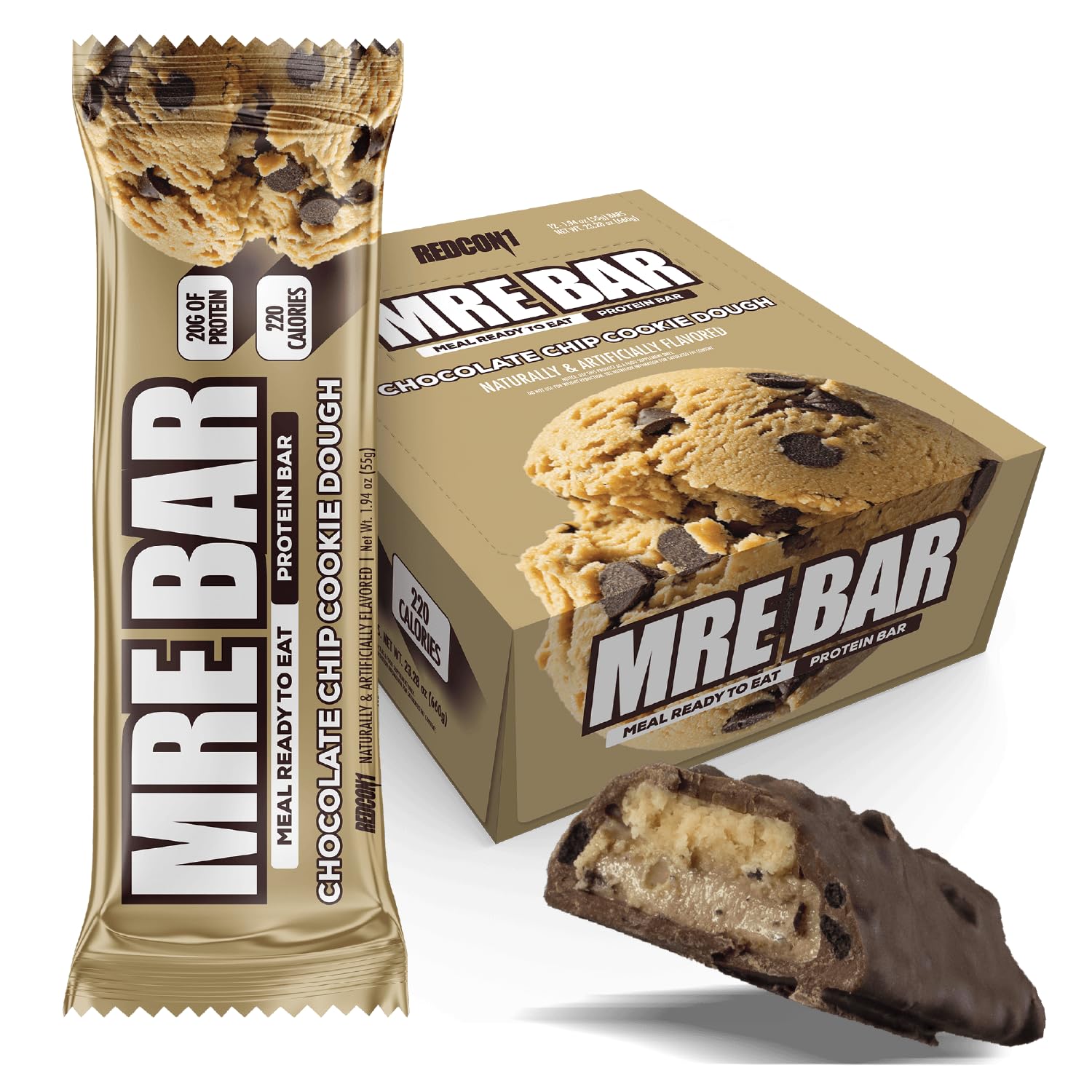 REDCON1 MRE Protein Bars Chocolate Chip Cookie Dough - 12 Count 20g High Protein Snack - Nutrition Bar - On-The-Go Breakfast or Post-Workout Snack