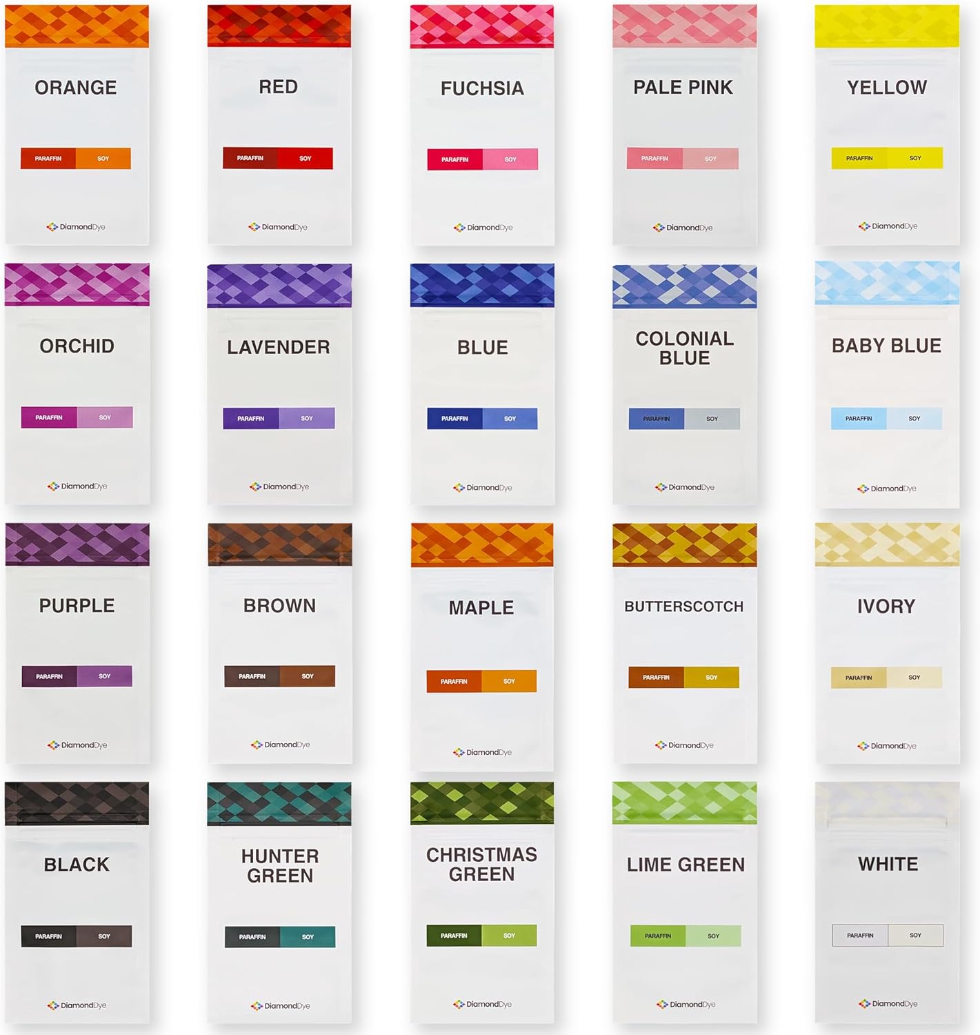 • You get 5 diamond shaped dye chips in each of our 20 most popular colors. 100 dye chips is enough candle wax dye to color approximately 100 paraffin candles or 50 soy candles, each weighing 1 pound.