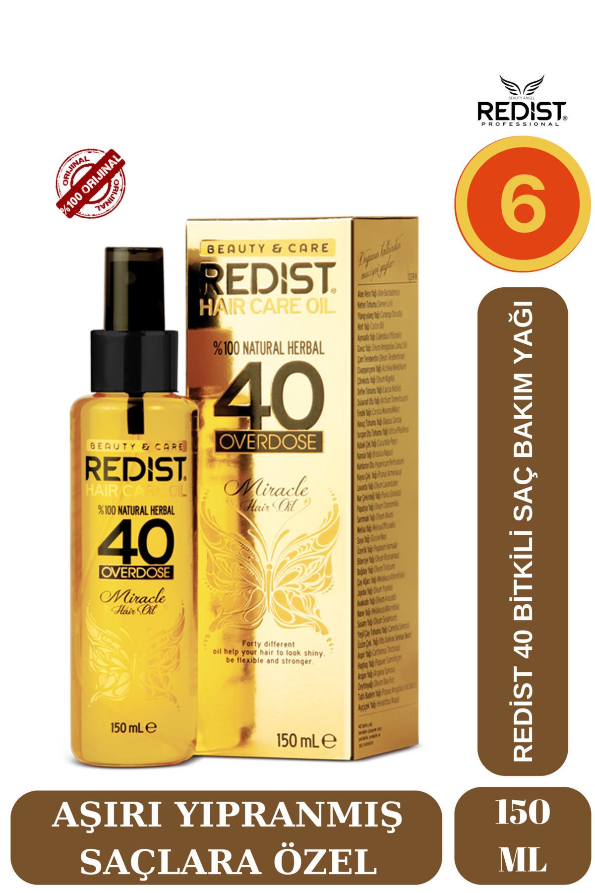 REDIST 40 OVERDOSE HAIR CARE OIL 150ML. 6 PIECES MIRACLE CARE OIL PRODUCED FROM 40 TYPES OF HERBS FROM REDIST.0 PRODUCED WITH NATURAL HERBS. Product Features • This product, which makes a miraculous touch to hair care, instantly nourishes your hair with the herbal extracts it contains. • Provides dazzling shine and silky softness to your hair. • It is effective against loss and dandruff. • Provides protection against environmental humidity. • 40 different oils work together to give hair shine, flexibility and strength. • Provides style control during blow drying. • Provides care by revitalizing the hair after dye perm and highlighting processes. • Strengthens weak and fragile hair. • Thanks to its unique formula, it nourishes the hair with valuable botanical oils without weighing it down. • Makes the blow drying process easier. • Only the main ingredient and valuable botanical oils remain in the areas of the hair where they need it. Thus, the hair does not become heavy. • Evaporation technology is a unique technology that combines the basic polymer and the active ingredient, which makes the hair surface soft and calm. It acts as a carrier and ensures that the oil is absorbed by the entire hair surface. Oils in Content: • ALOE VERA OIL • LINEN SEED • LANGUAGE OIL • CASTOR OIL • CALENDAR OIL • WALNUT OIL • PINE TURBENT • Yarrow oil • Black Cumin oil • Baylaurel seed oil • Burdock oil • HAZELNUT OIL • CARROT SEED OIL • NETTLE SEED OIL • PUMPKIN SEED OIL. OIL • CANOLA OIL • St. John's Wort OIL • APRICOT SEED OIL • LAVENDER OIL • POMEGRANATE SEED OIL • CHAMOMILE OIL • GARLIC OIL • MELISSA OIL • SOYBEAN OIL • SPELLING OIL • ROSEMARY OIL • WHEAT OIL • TEA TREE OIL • JOJOBA OIL • AVACADO OIL • MINT OIL • SESAME OIL • GREEN TEA SEED OIL • GRAPE SEED OIL • SASPIR OIL • WOODEN OIL • ARGAN OIL • OLIVE OIL • SWEET ALMOND OIL • SUNFLOWER OIL Application • Apply directly to the hair and scalp by massaging. After application, put a cap on the hair and leave it for 10-30 minutes. Optional. You can apply intensive cure programs of 2-3 hours. Rinse thoroughly with mild shampoo.