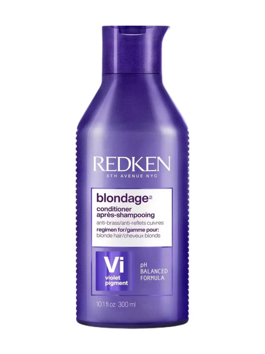 Redken Color Extend Blondage Anti-Yellow Toning Conditioner with Violet Pigment protects and maintains blonde and highlighted hair, giving it a cool tone without yellowing.