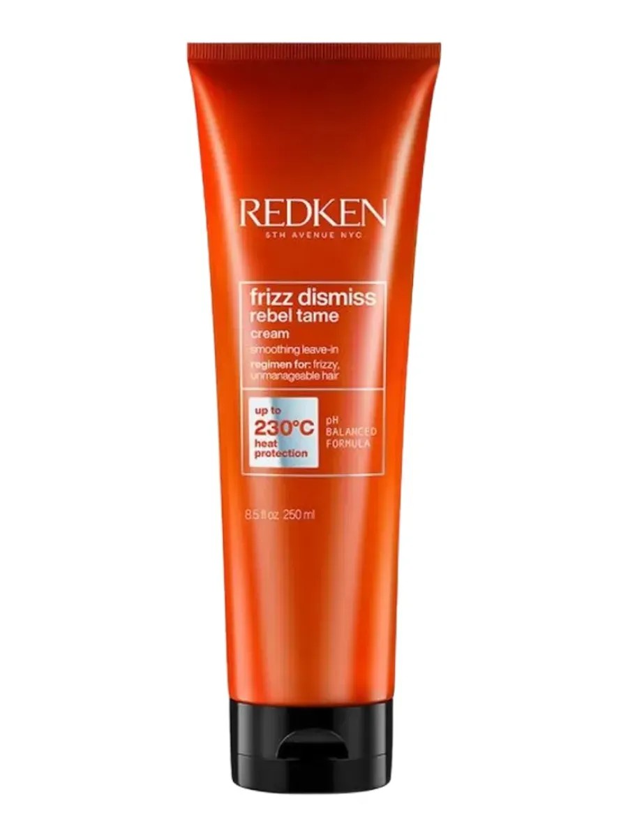 Tame unruly curls with this multi-benefit Redken Frizz Dismiss Rebel Tame leave-in cream. It smooths, provides heat protection, and controls frizz. Contains a Smoothing Complex with babassu oil to hydrate, detangle, and protect against frizz. Benefits: - Frizz-fighting cream for all hair types - Multi-benefit cream for all hair types - Moisturizes, detangles, and provides maximum frizz control - Especially suitable for unruly, curly hair - Protects hair at temperatures up to 450°F (232°C) - Leave-in conditioner without sodium chloride and sulfates. Hair Type: Suitable for curly, frizzy, and unruly hair.
