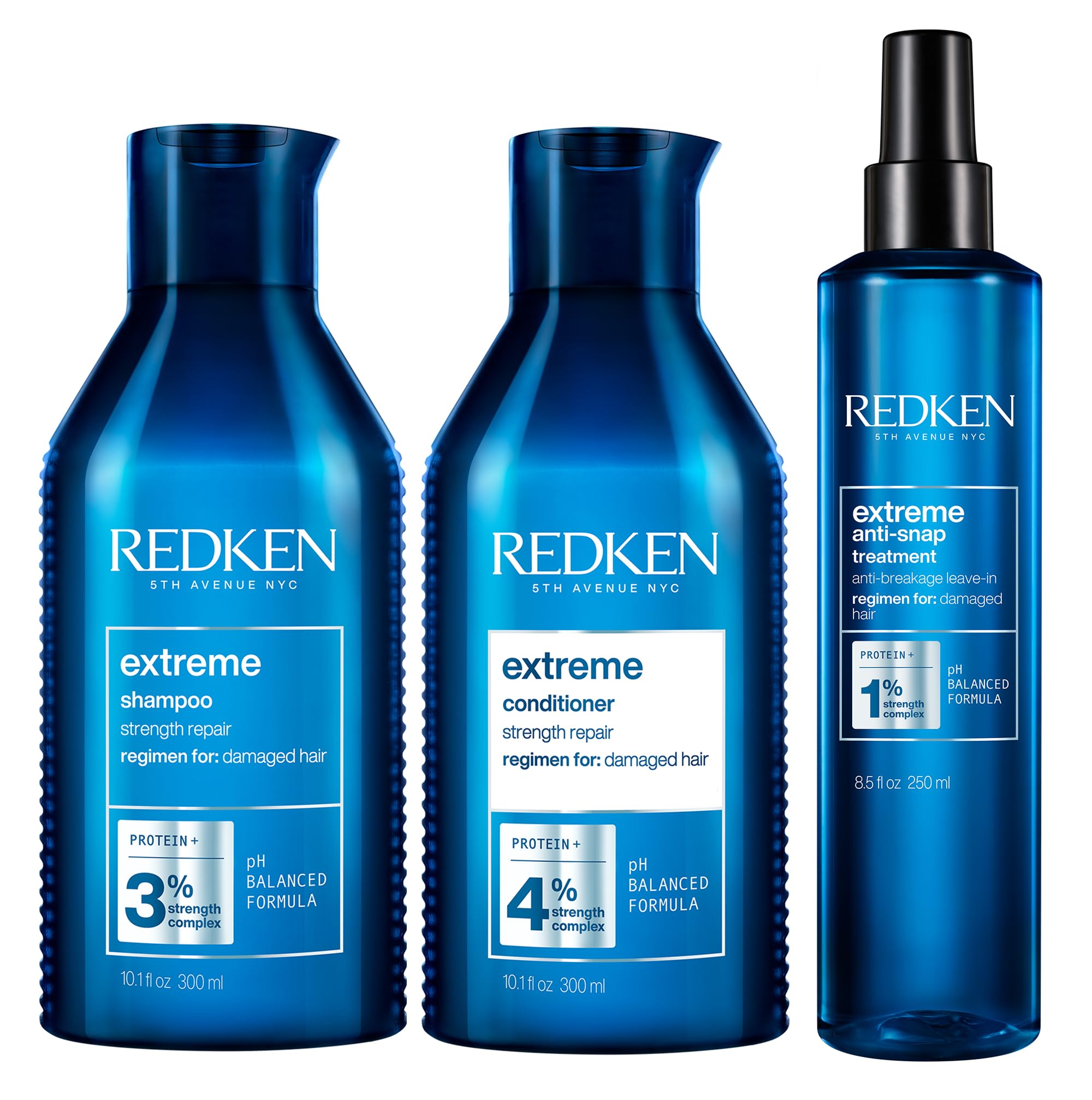 Routine For Weakened and Damaged Hair, Redken Extreme with Protein Hydrates, Restores Shine and Protects Against Hair Breakage and Heat. INSTRUCTIONS FOR USE Shampoo: Apply to wet hair, massage and rinse. Conditioner: Apply to the ends of the hair after washing, allow to work in and rinse thoroughly. Leave-in: Apply to towel-dried hair, do not rinse.Shampoo: Apply to wet hair, massage and rinse. Conditioner: Apply to the ends of the hair after washing, allow to work in and rinse thoroughly. Leave-in: Apply to towel-dried hair, do not rinse. The Routine with Protein Hydrates, Restores Shine and Protects Against Hair Breakage and Heat. Redken Extreme Set with shampoo, conditioner and leave-in treatment for weakened and damaged hair.Redken, Routine Voor Verzwakt en Beschadigd Haar, Set van Shampoo, Conditioner en Leave-In, Hydrateert, Herstelt Glans en Beschermt Tegen Haarbreuk, Met Proteïne, Extreme Routine Voor Verzwakt en Beschadigd Haar, Redken Extreme met Proteïne Hydrateert, Herstelt Glans en Beschermt Tegen Haarbreuk en Hitte. GEBRUIKSAANWIJZING Shampoo: Aanbrengen op nat haar, inmasseren en uitspoelen. Conditioner: Na het wassen aanbrengen op de haarpunten, laten inwerken en grondig uitspoelen. Leave-in: Aanbrengen op handdoekdroog haar, niet uitspoelen.Shampoo: Aanbrengen op nat haar, inmasseren en uitspoelen. Conditioner: Na het wassen aanbrengen op de haarpunten, laten inwerken en grondig uitspoelen. Leave-in: Aanbrengen op handdoekdroog haar, niet uitspoelen. De Routine met Proteïne Hydrateert, Herstelt Glans en Beschermt Tegen Haarbreuk en Hitte. Redken Extreme Set met shampoo, conditioner en leave-in treatment voor verzwakt en beschadigd haar.