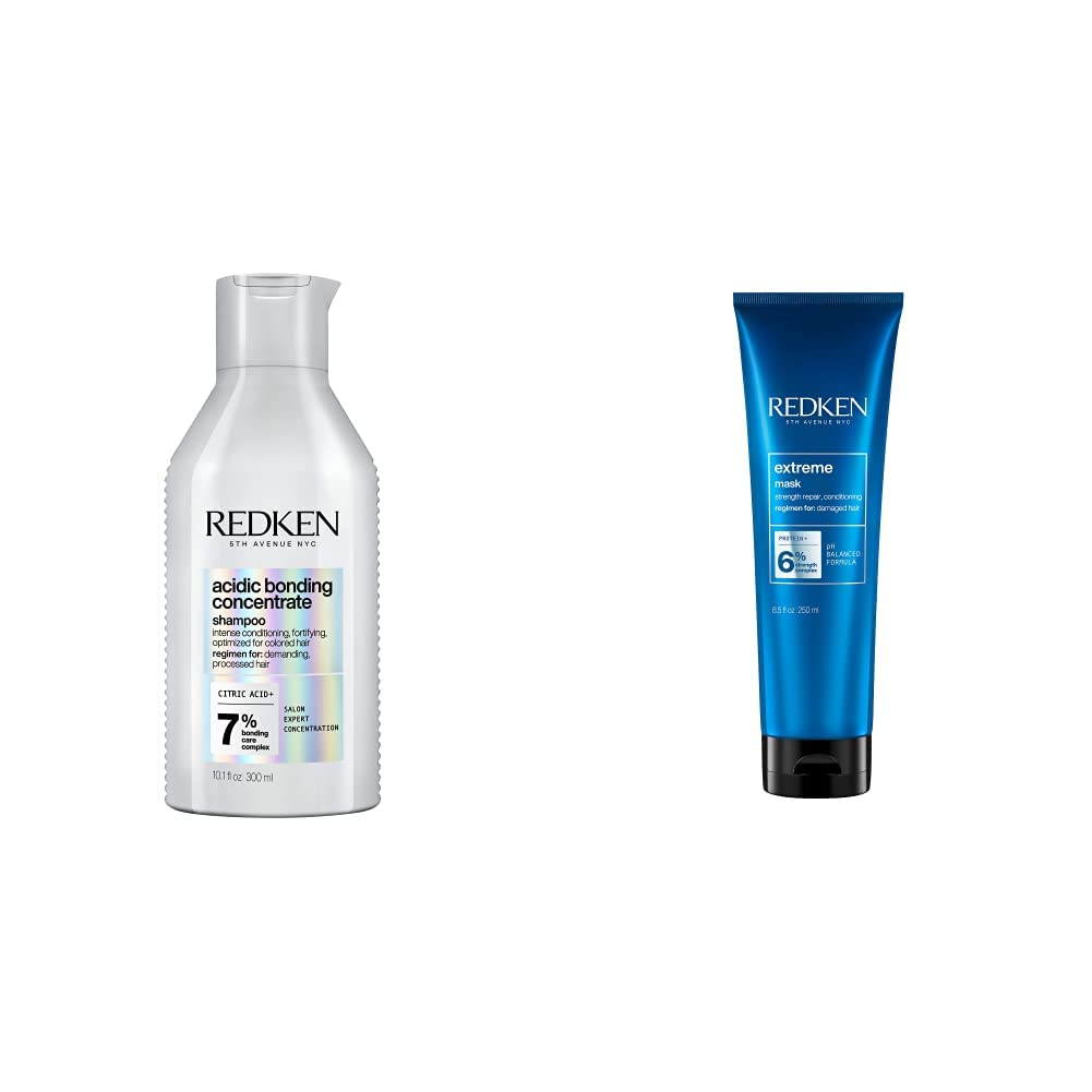 : Redken Acidic Bonding Concentrate Shampoo For Damaged Hair Bonding Treatment Citric Acid Hair Repair Color Protection 300 ml. Redken Acidic Bonding Concentrate Shampoo For Damaged Hair Bonding Treatment Citric Acid Hair Repair Color Protection 300 ml. Redken Intense Repair Mask for Damaged Hair, Rich in Protein, Extreme, 250 ml. Discover the full effectiveness of Redken! Thanks to a unique, science-based approach, our products are formulated to provide hydration and protein while respecting the hair's pH. Dermatologically tested and recommended by hair professionals. Redken's Extreme Mask deeply repairs damaged areas, strengthens hair from within, and restores its surface for intense shine. Using the shampoo, conditioner, and Anti-Snap Extreme reduces hair breakage by 75 . Technology Key Ingredients: Protein-based RCT technology provides deep conditioning to the hair fiber on 3 levels (root, length, tip). Proteins structure the roots. Arginine strengthens the lengths. Sepicap repairs the ends. Fortifying Complex technology restores the hair's protective lipid barrier. It smooths the hair cuticle, restoring health and shine. BRAND STORY: Redken 5th Avenue NYC is a professional hair care and color brand. Inspired by science and recommended by professionals, its products enhance your hair every day! Directions: Apply to wet hair, lather, and rinse. Follow with Acidic Bonding Concentrate conditioner.Product 2: Thanks to a unique, science-based approach, our products are formulated to provide hydration and protein while respecting the hair's pH. Product 2: Lactic Acid Violet Leaf Extract: Deep conditioning action. Product 1: Skin type: All. Product 1: Apply to wet hair, lather, and rinse. Then apply the Acidic Bonding Concentrate conditioner. Product 1: Concentrated bonding treatment with citric acid for an immediate transformation of even the most demanding hair. Product 1: Concentrated shampoo with citric acid bonding treatment to repair, strengthen, revitalize, and protect color.Description du produit Redken Shampooing Acidic Bonding Concentrate Pour Cheveux Abimés Soin Bonding Acide Citrique Réparation Cheveux Protection couleur 300 ml Redken Shampooing Acidic Bonding Concentrate Pour Cheveux Abimés Soin Bonding Acide Citrique Réparation Cheveux Protection couleur 300 ml . Redken Masque Réparateur Intense pour Cheveux Abimés, Riche en Protéines, Extreme, 250 ml Découvrez toute l'efficacité de Redken ! Grâce à une approche unique basée sur la science, nos produits sont élaborés pour apporter hydratation et protéines en respectant le pH du cheveu. Testés dermatologiquement et recommandés par les professionnels de la coiffure. Le masque Extreme de Redken répare en profondeur les zones fragilisées, fortifie le cheveu de l'intérieur et restaure sa surface pour une brillance intense. L'utilisation du shampoing, après shampoing et Anti-Snap Extreme réduit de 75 la casse des cheveux. Technologie Ingrédients clésLa technologie RCT à base de protéines apporte une action soin profonde à la fibre capillaire sur 3 niveaux (racine, longueur, pointe) Protéines de pour structurer les racines. Arginine pour renforcer les longueurs. Sepicap pour restaurer les pointes La technologie Fortifying complex restaure la barrière lipidique protectrice du cheveu. Elle lisse la cuticule du cheveu qui retrouve santé et brillance. HISTOIRE DE LA MARQUE Redken 5th Avenue NYC est une marque professionnelle de soins capillaires et de coloration. Inspirés par la science, recommandés par les professionnels, ses produits subliment vos cheveux au quotidien ! Mode d'emploi Appliquer sur cheveux humides, faire mousser et rincer. Appliquer ensuite l'après-shampooing Acidic Bonding Concentrate.produit 2: Grce à une approche unique basée sur la science, nos produits sont élaborés pour apporter hydratation et protéines en respectant le pH du cheveu. produit 2: Acide lactique Extrait de feuille de violette: Action soin au cœur de. produit 1: Skin type: All. produit 1: Appliquer sur cheveux humides, faire mousser et r er. Appliquer ensuite l'après-shampooing Acidic Bonding Concentrate. produit 1: Concentré en soin bonding à l'acide citrique pour une transformation immédiate des cheveux même les plus exigeants. produit 1: Shampoing concentré en soin bonding à l'acide citrique pour réparer, renforcer, revitaliser et protéger la couleur.Redken Shampooing Acidic Bonding Concentrate Pour Cheveux Abimés Soin Bonding Acide Citrique 300 ml Masque Réparateur Intense pour Cheveux Abimés, Riche en Protéines, Extreme, 250 ml Masque Réparateur Intense 250 ml