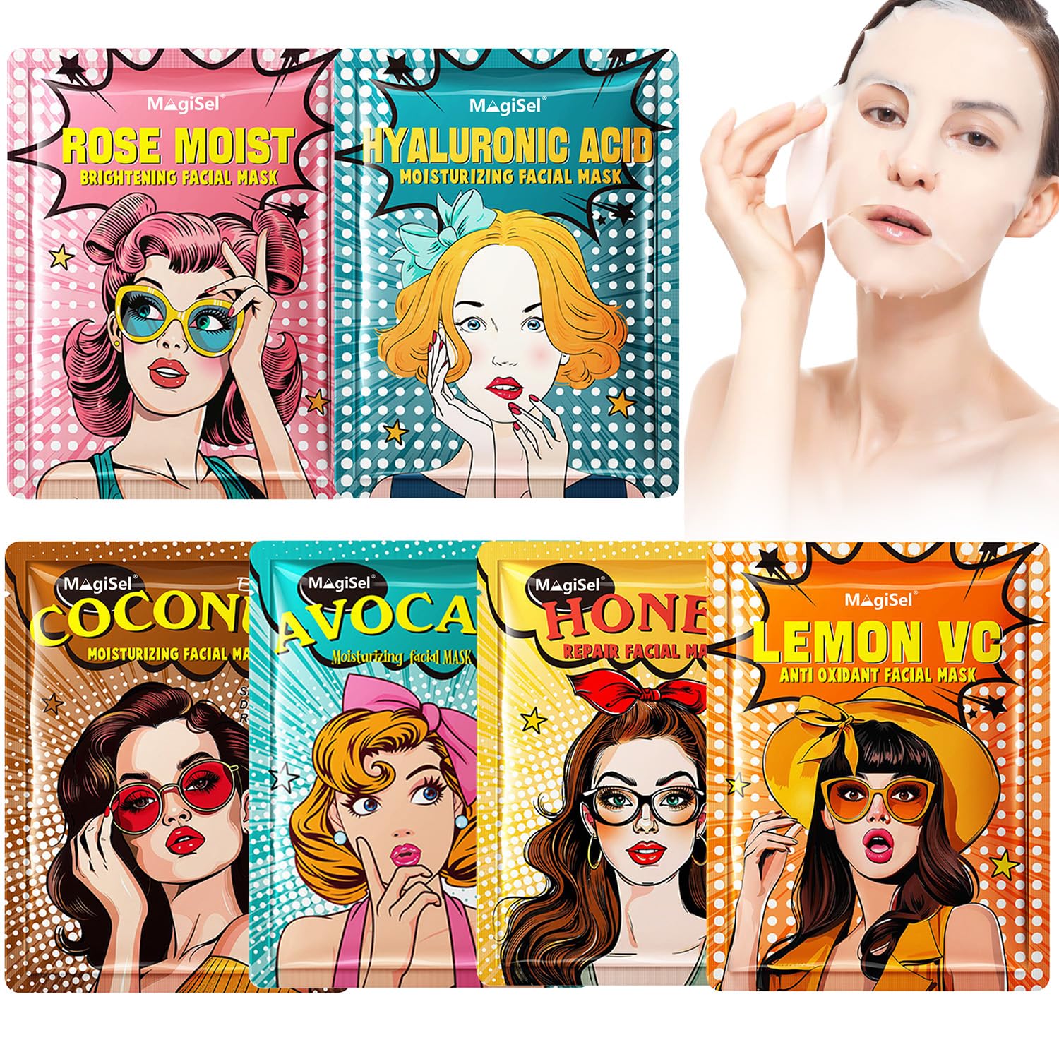 Hypoallergenic for all skin types: the mask is suitable for all skin types, the texture is soft and does not irritate the skin. Use is simple: after cleansing the face, take out the mask and apply it gently along the contours of your face, wait 15 minutes for the rich essence to fully penetrate and absorb, then remove the mask. Firming: Collagen maximizes skin penetration and absorption. It refines enlarged pores, improves skin elasticity immediately after use and visibly smooths the appearance of fine lines and wrinkles. Intensive Hydration: With strong moisturizing properties, these masks effectively replenish the skin's moisture, improve dry and dehydrated conditions, reduce dryness and feelings of tension, giving you long-lasting moisture. Contents of the package: Our product is a carefully composed set of 6 facial masks, each enriched with 6 different aromas, each enriched with unique active ingredients.Gezichtsmasker voor dames, dagelijkse verzorging gezichtsdoekmaskers, 6 stuks collageen hydrogel gezichtsmasker, hydraterend, huidversteviging, verhoogt de huidvochtigheid, voor alle huidtypesHypoallergeen voor alle huidtypes: het masker is geschikt voor alle huidtypes, de textuur is zacht en irriteert de huid niet. Gebruik is eenvoudig: na het reinigen van het gezicht haal je het masker eruit en breng het voorzichtig aan langs de contouren van je gezicht, wacht 15 minuten om de rijke essentie volledig binnen te dringen en te absorberen, en verwijder vervolgens het masker. Versteviging: collageen maximaliseert het binnendringen in de huid en de absorptie. Het verfijnt vergrote poriën, verbetert de huidelasticiteit direct na gebruik en maakt zichtbaar het uiterlijk van fijne lijntjes en rimpels glad. Intensieve hydratatie: met sterke vochtinbrengende eigenschappen vullen deze maskers effectief het vocht van de huid op, verbeteren droge en uitgedroogde toestanden, verminderen droogheid en spanningsgevoel, waardoor je langdurig vocht krijgt. Inhoud van de verpakking: ons product is een zorgvuldig samengestelde set van 6 gezichtsmaskers, elk verrijkt met 6 verschillende aroma's, elk verrijkt met unieke werkzame stoffen.
