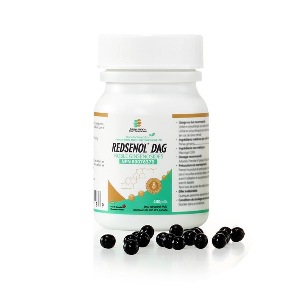 -Redsenol-DAG Rare Ginsenosides Sublingual Pills- Canada Royal Enoch Phytomedicine Ltd. select the highest quality Araliaceae ginseng species on a global scale (American ginseng, Asian ginseng, etc.), at the same time, extract and separate various ginsenosides from the root of the ginseng plants. Ginsenosides are the major pharmacologically active ingredients of ginseng, appear to be responsible for most of the bioactivities of ginseng. However, ginsenosides in their natural-occurring forms (prototype ginsenosides), cannot be directly absorbed into the human body. They must first undergo proper gastrointestinal metabolism and be converted into rare ginsenosides before effective absorption could take place. This proposes considerable difficulties for individuals with poor digestive functions. To produce usable rare ginsenosides for direct absorption, our team developed its own proprietary technology that successfully transformed large quantities of prototype ginsenosides into metabolized rare ginsenosides in industrialized settings. We meticulously select eight rare ginsenosides to formulate Redsenol-DAG sublingual pills. When taken sublingually, the active ingredients are delivered into the body by the absorption of the oral mucous membrane. Sublingually-administrated pills avoid the first pass effect that the bioavailability and potency are usually decreased when orally-administered ingredients pass through liver.Each Redsenol-DAG rare Ginsenosides pill has gone through 70 strict screenings by Labs-Mart Inc. located in Canada (i.e. 5 heavy metal contaminants screenings, 5 microbial contaminants screenings, 60 pesticide residue screenings). The whole manufacturing process is carried out in GMP standard manufacturing workshop located at Vancouver, Canada. The total amount of rare ginsenosides contained in 100 g Redsenol-DAG pills is equal to or greater than 18 g, amongst which active ingredients constitute no less than 18 . The active ingredients of the Redsenol-DAG rare ginsenosides sublingual pills, are transformed from proto-ginsenosides that are naturally extracted from various Araliaceae ginseng species, e.g. Asian ginseng (AG, P. ginseng), American ginseng (AmG, P. quinquefolius), and notoginseng (NG, P. notoginseng). Redsenol-DAG is taken under the tongue and absorbed by oral mucous membrane, through which the active ingredients are delivered into the body in just 15 to 20 minutes with full bioavailability and potency, achieving optimal absorption for those who have trouble swallowing pills, tablets or capsules. We meticulously select eight highly active rare ginsenosides, i.e. Rk2, Rh3, aPPD(S, R), Rk1, Rg5, aPPT(S, R), which are lipid-soluble small molecules and good for absorption.