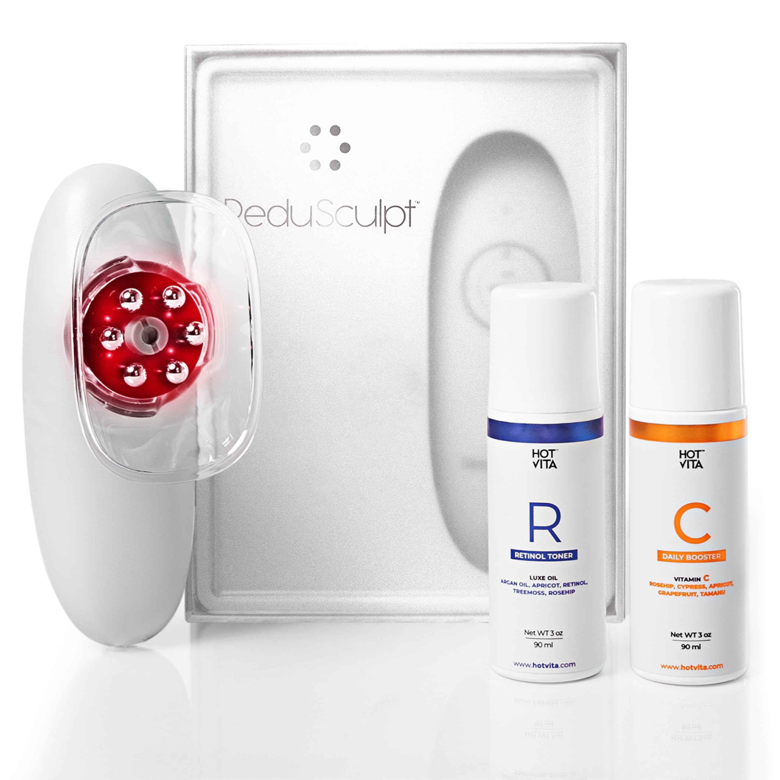 Discover an elevated at-home personal care routine with the Redu Sculpt Vitamin C Retinol Kit, a thoughtfully designed 3-piece system created to complement everyday self-care. This bundle includes the Redu Sculpt handheld device along with two premium treatment oils — Vitamin C and Retinol — formulated to support skin hydration, radiance, and a refreshed appearance. The device delivers a gentle, targeted massage experience designed to help warm and prepare the skin, while the included oils enhance glide and comfort during use. Together, they create a routine that feels luxurious, relaxing, and easy to incorporate into daily care. Designed for external personal care use, this 3-piece set brings a spa-inspired experience into the comfort of your home, making it a convenient addition to any wellness or beauty routine.