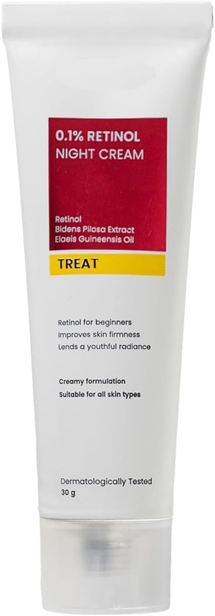 Fragrance-free, Hydrating, Non-Comedogenic, Paraben-free Retinol Cream. Reduces Fine Lines Wrinkles - 0.1 Retinol Night Cream helps reduce fine lines and wrinkles by increg skin elasticity and skin cell turnover rate. Use this anti-ageing cream every night for best results. Gives a Youthful Glow - This anti-ageing cream increases collagen production in the skin, which naturally reduces as we age, making the skin plump and giving a youthful glow. Improves Skin Texture - 0.1 Retinol Night Cream helps clear the skin texture gradually by reducing enlarged pores, exfoliating dead skin cells, and clearing dark spots and blemishes on the skin. Beginner-friendly Retinol Night Cream - This low-concentration Retinol cream is formulated for skin new to Retinol. It is suitable for all skin types, including sensitive skin.