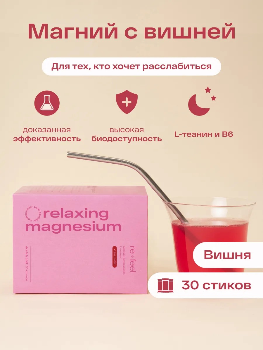 Цитрат магния бренда re-feel обеспечит эффективную поддержку нервной системы и поможет противостоять стрессу. БАД обладает натуральным составом без искусственных красителей и ароматизаторов. В нем содержится сублимированная вишня, благодаря которой биологически активная пищевая добавка приобретает приятный ягодный вкус. Главным действующим веществом выступает магний аквамин в форме цитрата, отличающийся высокой усвояемостью. В одной порции содержится его дневная норма. Этот минерал смешивается с лимонной кислотой. Формула обогащена витамином В6, усиливающий эффект магния. Также в состав включена аминокислота L-теанин, стимулирующая мозговую деятельность. Витаминный БАД рефил с высокой концентрацией крайне важного для женского и мужского организма микроэлемента насыщает энергией и способствует повышению концентрации внимания. Препарат на природной основе улучшает кровообращение и положительно отражается на состоянии мышц, сосудов и костей. Средство обладает успокоительным эффектом, действует как легкое снотворное и антидепрессант. Оно способствует улучшению качества сна и устранению стресса, нормализации работы ЖКТ и восстановлению здоровья. Правильно подобранная формула укрепляет сердце и улучшает память, снижает уровень стресса и обеспечивает расслабление. Продукция выпускается в порошковой форме. Она предназначена для приема внутрь. Для этого необходимо развести порошок в чистой питьевой воде. В итоге получается вкусный и полезный напиток. Он принесет немалую пользу всем взрослым женщинам и мужчинам, пожилым людям. В упаковке находится 30 пакетиков. Препарат премиум-качества не является лекарством. Он отлично растворяется в воде и усваивается в желудке на 99%. Прием его следует осуществлять строго по инструкции или в соответствии с рекомендациями врача. Превышать указанную дозировку настоятельно не рекомендуется. Для хранения средства следует выбрать сухое, защищенное от прямых солнечных лучей и недоступное для детей место. Эту биологически активную добавку без ГМО можно рассмотреть в виде практичного презента для всех близких людей. Первые результаты в виде снижения стресса вы сможете почувствовать уже через 24 часа. Через 2-4 дня улучшится сон, а через 7 - память и работа мозга. Страна производства - Россия.