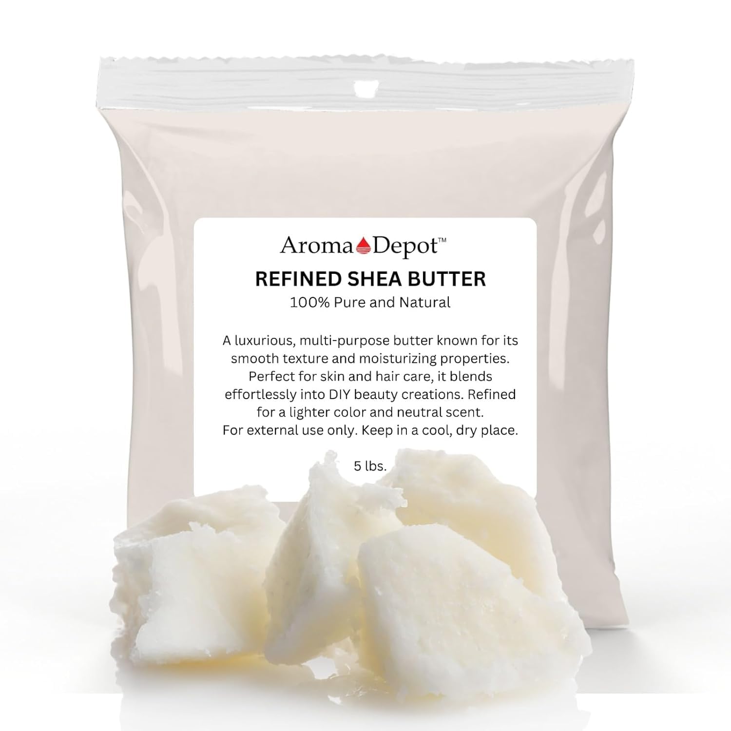 MULTI-PURPOSE: Our Shea Butter can be used for a variety of purposes, including as a moisturizer for the face and body, a natural lip balm, a hair conditioner, and more. SOFTENS AND SMOOTHS SKIN: The high content of natural fats in Shea Butter helps to soften and smooth the skin, making it an excellent choice for skincare products, especially for those with sensitive or dry skin. NOURISHING MOISTURIZING: Our Shea Butter is rich in essential fatty acids, including oleic, stearic, linoleic, and palmitic acids, as well as natural vitamins A, E, F. These nutrients help to moisturize and nourish the skin, making it ideal for dry, chapped, or irritated skin. ETHICAL SUSTAINABLE: We source our Shea Butter from ethical and sustainable suppliers who are committed to supporting local communities and preserving the natural beauty of the region. 100 VEGAN FRIENDLY: Our Shea Butter is suitable for Vegans Vegetarians as it does not contain any animal-derived ingredients and is not tested on animals. External use only. Our Shea Butter is 100 Refined, maintaining its pure form with a distinct oily, nutty, and smoky scent. Note that it may not be odorless. Small impurities and sediment, like plant fiber, are normal in Refined Shea Butter. Embrace the natural essence and qualities of Aroma Depot Shea Butter for your skincare needs.