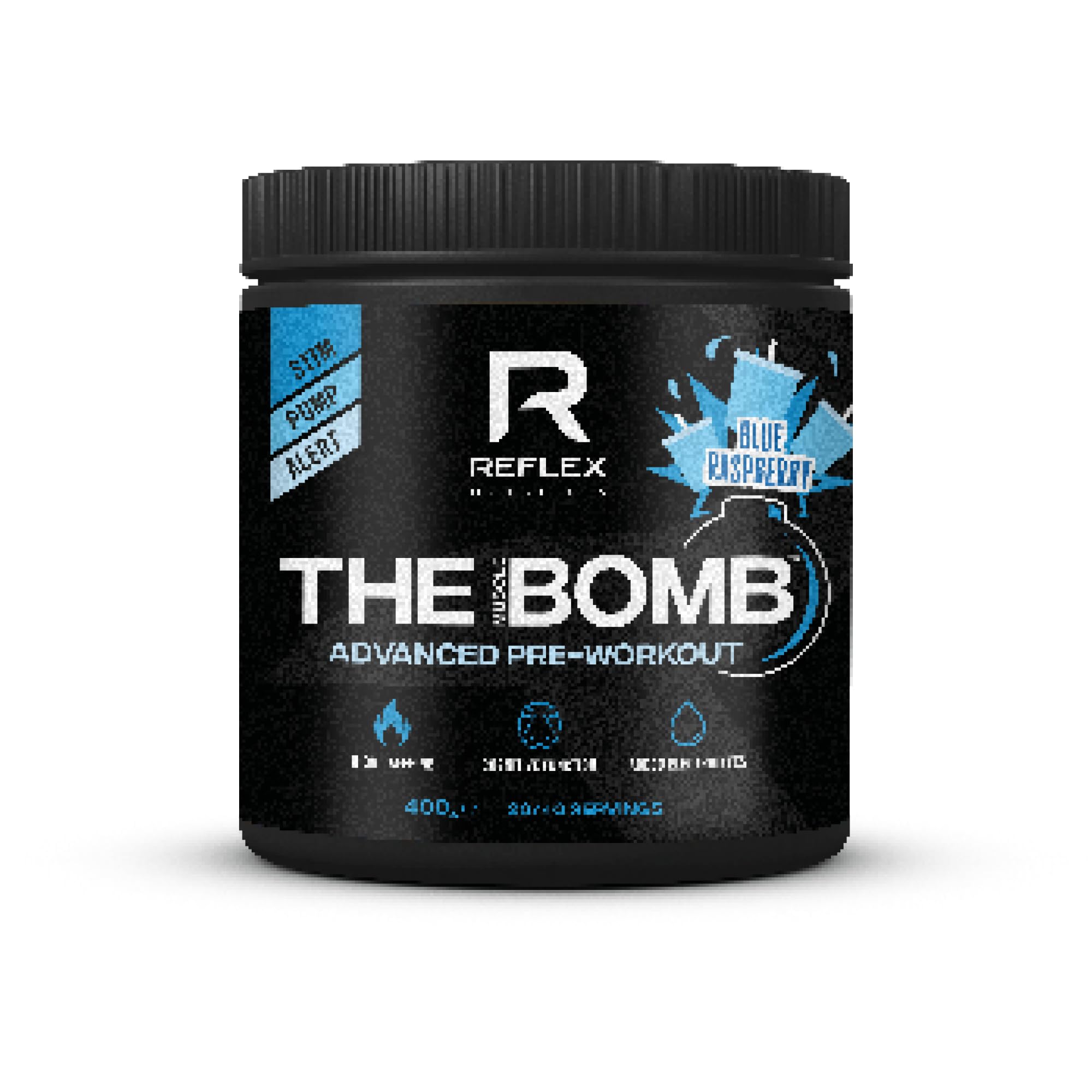 Reflex: The powerful pre-workout, scientifically formulated to prepare you mentally and physically for action. Not only is it one of the most potent pre-workouts on the market, but Reflex also claims to have the best taste, launching in 3 explosive flavors: Lemon Sherbet, Twizzle Lolly, and Sour Apple. Designed for enthusiasts and drivers, this pre-workout powerhouse is engineered to energize, pump, and boost alertness. INGREDIENTS Citrulline malate, beta-alanine, anhydrous betaine, L-tyrosine, flavoring, L-taurine, potassium chloride, magnesium citrate, maltodextrin, anhydrous caffeine, sweeteners (acesulfame, sucralose, steviol glycosides), sodium chloride, anti-caking agents (calcium silicate, silicon dioxide), zinc bisglycylglycerin. cinate, colour (brilliant blue FCF), vitamin B6 (pyridoxine hydrochloride), vitamin B12 (methylcobalamin), folic acid (teroylmonoglutamic acid).Electrolyte Blend: Lifting weights and hitting PBs is a sweaty business, staying hydrated is essential. Vitamin Blend: Combats fatigue and tiredness for unstoppable drive. 2.5g Beta-Alanine: Boost your natural beta-alanine stores to help regulate acid buildup in muscles and delay fatigue, so you can focus on maximizing your effort, rep after rep. 9g Citrulline Malate (6mg Active Citrulline): Citrulline is broken down into arginine in the kidneys. Arginine plays a key role in the production of nitric oxide, which widens blood vessels, improves blood flow, and floods your muscles with nutrient-rich blood. 350mg Caffeine: Powerful caffeine to keep you energized and motivated throughout your workout. Crush every set, conquer every challenge, and push through with unmatched intensity. Our pre-workout is not only one of the most powerful pre-workouts on the market, Reflex claims to have made the best taste, this pre-workout powerhouse is designed to stimulate, pump and increase alertness.Reflex Nutrition Pre-Workout The Muscle Bomb 350 g de caféine 9 g de malate de citrulline 2,5 g de bêta-alanine d'électrolytes d'hydratation ajoutés (framboise bleue, 400 g)DESCRIPTION DU PRODUIT DESCRIPTION DU PRODUIT Reflex Le puissant pré-entraînement, scientifiquement formulé pour vous préparer mentalement et physiquement à l'action. Non seulement c'est l'un des pré-entraînements les plus puissants sur le marché, Reflex affirme avoir fait le meilleur goût, en lançant dans 3 saveurs explosives : Lemon Sherbet, Twizzle Lolly et Sour Apple. Conçu pour les passionnés et les conducteurs, cette centrale de pré-entraînement est conçue pour stimuler, pomper et augmenter l'alertesse. INGRÉDIENTS Malate de citrulline, bêta-alanine, bétaïne anhydre, L-tyrosine, arôme, L-taurine, chlorure de potassium, citrate de magnésium, maltodextrine, caféine anhydre, édulcorants (acésulfame, sucralose, glycosides de stéviol de stévia), chlorure de sodium, agents anti-agglomérants (silicate de calcium, dioxyde de silicium. ide), zinc bisglyglyc. cinate, couleur (bleu brillant FCF), vitamine B6 (chlorhydrate de pyridoxine), vitamine B12 (méthylcobalamine), acide folique (acide téroylmonoglutamique).Mélange d'électrolytes : soulever des poids et frapper des PB est une affaire en sueur, rester hydraté est essentiel, mélange de vitamines : combat la fatigue et la fatigue et obtenez une conduite imparable. 2,5 g de bêta-alanine : boostez vos réserves naturelles de bêta-alanine pour aider à réguler l'accumulation d'acide dans les muscles et retarder la fatigue, afin que vous puissiez vous concentrer sur maximiser vos efforts, répétition après répétition. 9 g de malate de citrulline (6 mg de citrulline active) : la citrulline est décomposée en arginine dans les reins. L'arginine joue un rôle clé dans la production d'oxyde nitrique, qui élargit les vaisseaux sanguins, améliore la circulation sanguine et inonde vos muscles avec du sang riche en nutriments. 350 mg de caféine : caféine puissante pour vous garder énergique et motivé tout au long de votre entraînement, écrasez chaque série, relevez chaque défi et passez à travers avec une intensité inégalée. Notre pré-entraînement n'est pas seulement l'un des pré-entraînements les plus puissants sur le marché, Reflex affirme avoir fait le meilleur goût, cette centrale de pré-entraînement est conçue pour stimuler, pomper et augmenter l'alertesse.