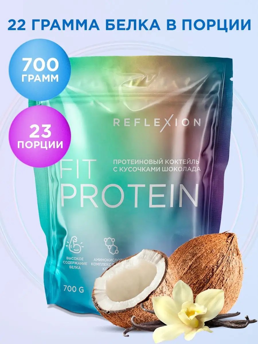 Протеиновый коктейль с кусочками шоколада от Reflexion – высокобелковая смесь с ярким насыщенным вкусом отлично подойдёт приверженцам здорового питания, а также спортсменам для восстановления сил и энергии в процессе активных тренировок. Протеин Fit Protein отлично сбалансирован и хорошо усваивается организмом. Он способствует долгому насыщению, препятствует катаболизму и ускоряет набор мышечной массы. Благодаря гармоничному вкусу и хорошей растворимости, протеиновая смесь шоколадная с кусочками шоколада идеальна в качестве быстрого перекуса.