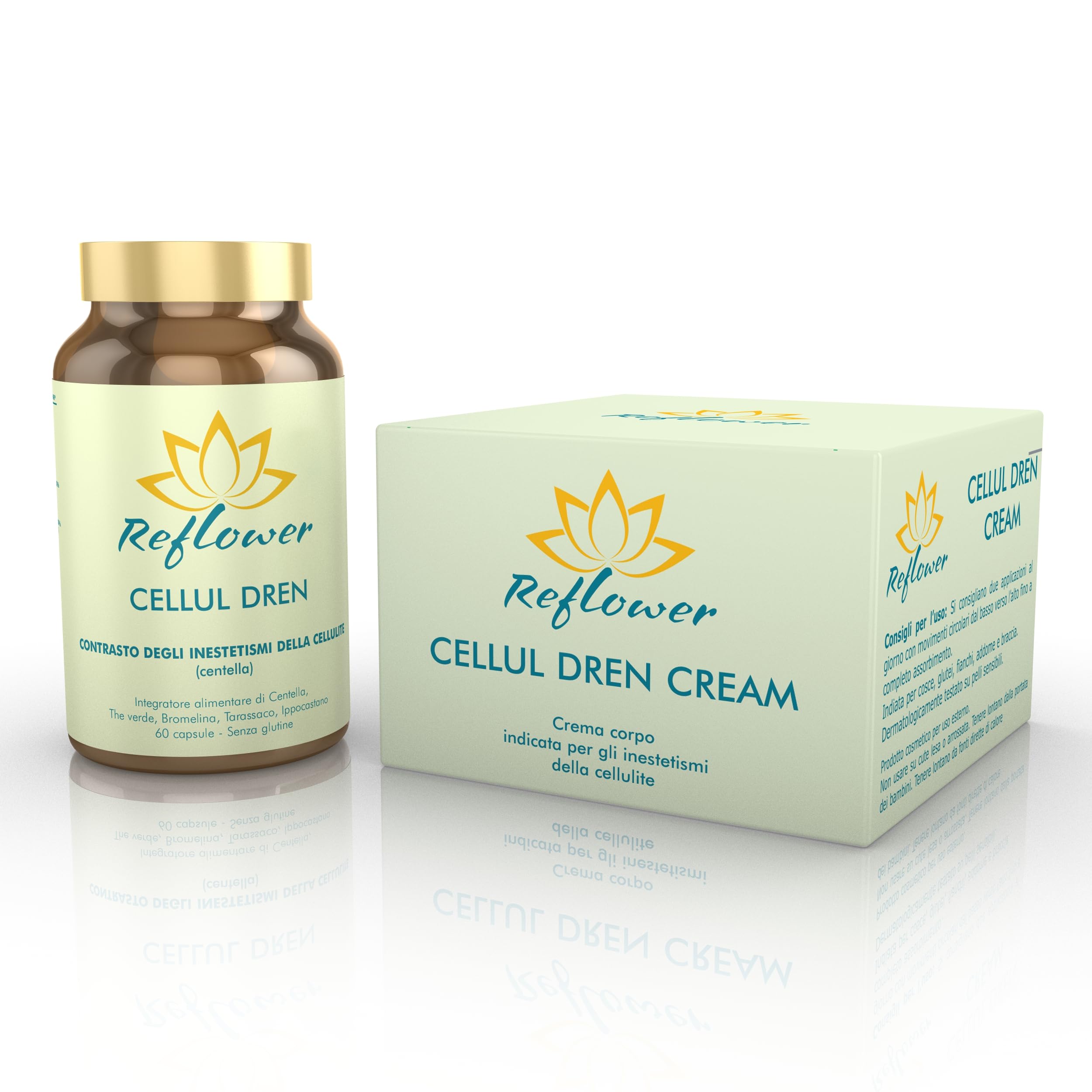 The ideal kit for those who want to naturally combat cellulite imperfections. With a high concentration of active ingredients, it promotes the shrinking of fat cells on the buttocks and thighs, improving the function of cutaneous microcirculation, stimulating the drainage of bodily fluids, and helping to reduce the feeling of heaviness in the legs. INGREDIENTS Cellul Dren capsules: coating agent: food-grade gelatin green tea extract (Camellia sinensis L. Kuntze: leaves, 40 polyphenols), bromelain, dandelion extract (Taraxacum officinale: leaves, 20:1), Centella asiatica extract (Cente asiatique L.: aerial parts, 20 asiatica), Coleus forskohlii extract (Coleus forskohlii (Willd.) Bricq: roots, 10 forskolin), horse chestnut extract. (Aesculus hippocastanum L.: bark, 15 escin), phosphatidylserine 20 (contains SOIA), L-ascorbic acid (vitamin C), undaria extract (Undaria pinnatifida: thallus, 10 fucoxanthin), CERAMOSIDES™ (plant ceramides - Triticum aestivum L. fruit extract standardized in sphingolipids including glycosylceramides and digalactosyl diglycerides), bioflavonoids (50 from Citrus maxima, paradisi, and aurantium dulcis), anti-caking agents: vegetable magnesium stearate and colloidal silica long pepper extract (Piper longum L.: fruit, 90 piperine), chromium picolinate Cellul dren cream: Aqua, Glyceryl stearate Se, Ethylhexyl palmitate, Glycerin, Caprylic Capric triglyceride, Aloe Barbadensis leaf Juice, Glyceryl stearate, Cetearyl alcohol, Escin, Butyros. permum parkii butter, Polyglyceryl-10 laurate, Polyglyceryl-6 oleate, caffeine, sorbitan palmitate, Coffea Arabica seed extract, Hedera Helix leaf extract, Centella Asiatica leaf extract, Zingiber officinale root extract, Tocopheryl aceate, Glycine Soja germ extract, Argania spinosa Kernel Oil, Coil, Coil, Coil, Coil, Coil, leus forskohoh. lii root extract, Citrus Grandis seed extract, Ruscus Aculeatus root extract, Fucus Vesiculosus extract, Trigonella Foenum-Graecum seed extract, Ananas Sativus fruit extract, Camellia Sinensis leaf extract, Parfum, Lactic acid, Citric acid, Ethylhexylglycerin, Sodium benzoate, Potassium sorbate, essence. yl alcoholFrom the very first applications, your skin will appear soft, even, and radiant. It has a creamy texture that absorbs quickly. Rich in active ingredients: its formula, based on caffeine, escin, pineapple extract, ivy, centella, aloe, green tea, butcher's broom, coleus forskohlii, and fucus seaweed, helps to energize and revitalize for more beautiful legs. Indicated for hydrating and nourishing the skin, you can use it on thighs, buttocks, hips, abdomen, and arms. Cellul Dren Cream: Contains an ingredient that supports the skin's trophism, function, and the body's purifying functions. Contains green tea with antioxidant properties. Contains dandelion, beneficial for draining bodily fluids and supporting urinary tract function. Based on plant extracts that help reduce the appearance of cellulite and improve microcirculation (relieving heavy legs). Cellul dren cps:.Reflower - Kit Cellul Dren 60 cps Cellul Dren Cream 200 ml - Traitement pour lutter contre les imperfections de la celluliteDESCRIPTION DU PRODUIT DESCRIPTION DU PRODUIT Le kit idéal pour ceux qui veulent lutter naturellement contre les imperfections de la cellulite. Avec une forte concentration de principes actifs, il favorise le rétrécissement des cellules graisseuses sur les fesses et les cuisses, améliorant les fonctionnalités de la microcirculation cutanée, stimulant le drainage des liquides corporels et contribuant à réduire la sensation de lourdeur des jambes INGRÉDIENTS Cellul dren cps : agent de revêtement: gélatine alimentaire toi vert e.s. (Camélia sinensis L. Kuntze: feuilles, 40 polyphénols), bromélaïne, pissenlit e.s. (Taraxacum officinal : feuilles, 20:1), Centella e.s. (Cente asiatique L.: parties aériennes, 20 asiatique), Coleus Forskohlii e.s. (Coleus Forskholii (Willd.) Bricq : racines, 10 forskoline), marronnier hippo. (Aesculus hippocastanum L.: écorce, 15 escine), phosphatidylsérine 20 (contient SOIA), acide L-ascorbique (vitamine C), undaria e.s. ( Undaria pinnatifida : thallo, 10 fucoxanthine), CERAMOSIDES™ (céramides végétales -Triticum aestivum L. fruit extrait standardisé en sphingolipides dont glycosylcéramides et digalactosil diglycérides), bioflavonoïdes (50 de Citrus maxima, paradissionissionissions. i et aurantium dulcis), agents anti-agglomérants : stéarate de magnésium végétal et silice colloïdale poivre long e.s. (Piper longum L.: fruit, 90 pipérine), chrome picoliné Cellul dren cream : Aqua, Glyceryl stearate Se, Ethylhexyl palmitate, Glycerin, Caprylic Capric triglyceride, Aloe Barbadensis leaf Juice, Glyceryl stearate, Cetearyl alcool, Escin, Butyros. permum parkii butter, Polyglyceryl-10 laurate, Polyglyceryl-6 oléate, caféine, sorbitan palmitate, Coffea Arabica seed extract, Hedera Helix leaf extract, Centella Asiatica leaf extract, Zingiber officinale root extract, Tocopheryl acéate, Glycine Soja germ extract, Argania spinosa Kernel Oil, Coil, Coil, Coil, Coil, Coil, leus forskohoh. lii root extract, Citrus Grandis seed extract, Ruscus Aculeatus root extract, Fucus Vesiculosus extract, Trigonella Foenum-Graecum seed extract, Ananas Sativus fruit extract, Camellia Sinensis leaf extract, Parfum, Lactic acid, Citric acid, Ethylhexylglycerin, Sodium benzoate, Potassium sorbate, essence. yl alcooldès les premières applications, votre peau paraîtra douce, uniforme et lumineuse. a une texture crémeuse qui s'absorbe rapidement. Riche en principes actifs : sa formulation à base de caféine, escine, extraits d'ananas, lierre, centella, aloe, thé vert, rusc, coleus forskohlii et algue fucus, aide à dynamiser et revitaliser pour des jambes plus belles . Indiquée pour hydrater et nourrir la peau, vous pouvez l'utiliser sur les cuisses, les fesses, les hanches, l'abdomen et les bras. Cellul dren Cream :. Contient un produit qui aide le trophisme, la fonc