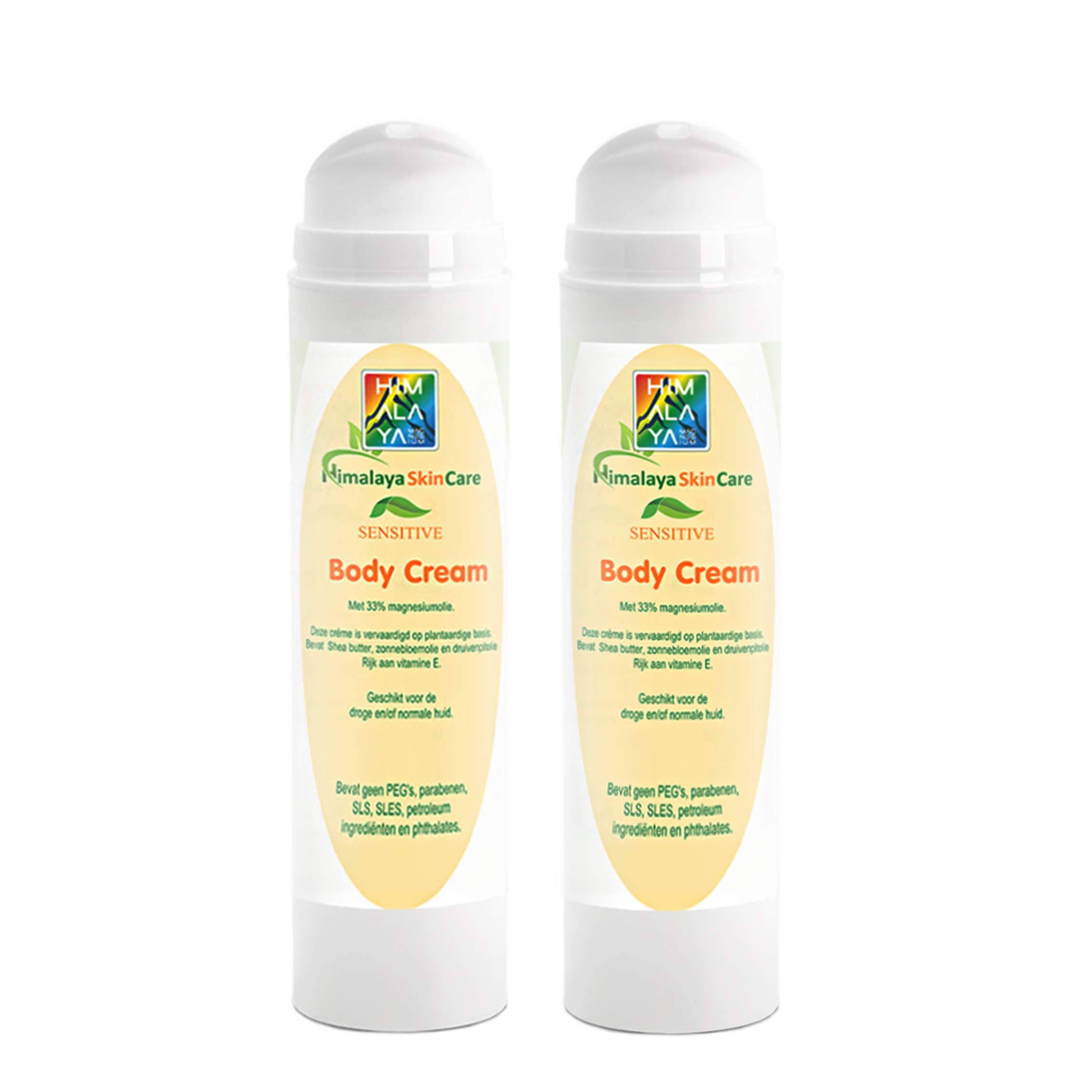 Himalaya Body Cream SkinCare Sensitive 150ml, for normal to dry skin. Now in an airless pump bottle (including the cap). The airless pump bottle is designed to dispense the contents without air entering the bottle. The bottle is perfect for home or travel. - Himalaya Sensitive Body Cream combines the beneficial action of 33 pure, unrefined magnesium oil with nourishing and soothing plant-based ingredients. - Use Himalaya Magnesium Body Cream as needed. - Suitable for use all over the body. Massage the magnesium body cream onto clean, dry skin. For best results, use after a bath or shower. Avoid contact with eyes. Do not use on broken skin.Use within 12 months of opening. Capacity per bottle: 150 ml. Ingredients: Aqua, Magnesium Chloride, Aqua, Helianthus Annuus (Sunflower) Seed Oil, Butyrospermum Parkii (Shea) Butter, Glyceryl Mono Stearate, Theobroma Cocoa Seed Butter, Cetearyl Alcohol, Copernicia Cerifera (Carnauba) Wax, Coco Glucoside, Phenyloxyethanol, Bentonate, Xanthan Gum, Dehydroacetic Acid.Crème pour le corps au magnésium de l'Himalaya 2 x 150 mlDESCRIPTION DU PRODUIT Himalaya Body Cream SkinCare Sensitive 150 ml, pour peaux normales et sèches. Maintenant dans un flacon pompe Airless (y compris le bouchon). Le flacon pompe Airless est conçu pour pousser le contenu sans que l'air ne pénètre à l'intérieur. La bouteille est parfaite pour la maison ou les voyages. - La crème pour le corps sensible de l'Himalaya combine l'action bénéfique de 33 d'huile de magnésium pure non raffinée avec des ingrédients végétaux nourrissants et apaisants. - Utilisation de la crème corporelle de l'Himalaya magnésium selon vos besoins. - Convient pour une utilisation sur tout le corps. Massez la crème pour le corps au magnésium sur une peau propre et sèche. Pour le résultat souhaité, utilisez après un bain ou une douche. Évitez tout contact avec les yeux. Ne pas utiliser sur une peau endommagée.Utilisation dans les 12 mois suivant l'ouverture. Capacité par flacon : 150 ml. Ingrédients : Aqua, chlorure de magnésium, Aqua, Helianthus Annus (Sunflower) Seed Oil, Butyrospermum Parkii (Shea) Butter, Glyceryl Mono Stearate, Theobroma Cocao Seed Butter, Cetearyl Alcohol, Copernicia Cerifera (Carnauba) Wax, Coco Glucoside, Phenheni oxyéthanol, benne Acide zoique, gomme Xanthan, acide déhydroacétique.