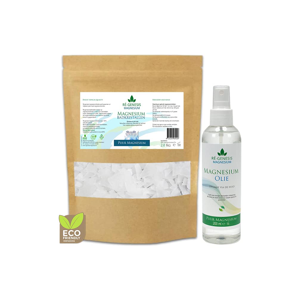Ré-genesis magnesium bacrystals 2.5 kg, you can easily make a magnesium foot bath and bath at home within a few minutes. A bath with 100 pure magnesium crystals is the perfect way to relax after a long day or heavy physical exertion. Magnesium supports the energy level and contributes, among other things, to the normal functioning of the nervous system.magnesium bath salts.magnesium salt contains a significantly higher concentration of magnesium (47 ). Ingredients magnesium flakes: Aqua, magnesium chloride (47 ). --- Ré-genesis magnesium oil spray activates your natural energy in the body and helps with fatigue. Magnesium oil gets its name from its oily structure, even though it is not really an oil. It is a saturated magnesium chloride solution in the most concentrated form possible. Suitable for application on the skin. Ré-genesis magnesium oil consists of pure spring water and pure elemental magnesium chloride with a high content of 31 magnesium chloride. Ré-genesis magnesium oil is a 100 pure natural product without added ingredients. Ingredients: Aqua, 31 Magnesium Chloride. INGREDIENTS Aqua, magnesium chloride 31 (oil) and magnesium chloride 47 (flakes)HANDY SPRAY BOTTLE - 100 magnesium oil spray in a handy spray bottle that you can take anywhere. STRONG KRAFT STAND-UP POUCH - To reduce plastic packaging consumption for our products, we pack magnesium salt in a sturdy and resealable "Eco" stand-up pouch. MAGNESIUM FLAKES 47 - The magnesium chloride concentration of magnesium crystals is 47 and is therefore ideally suited for transdermal magnesium absorption. MAGNESIUM THE MIRACLE MINERAL - Activates your natural energy, reduces muscle cramps, relaxes the muscles and helps with fatigue. 100 NATURAL - Our magnesium bath crystals are 100 natural and contain no dyes, fragrances or preservatives. Magnesium oil for transdermal use. Suitable for applying to the skin (arms, legs, abdomen, feet and back). Fast absorption. 100 ORIGINAL FROM HIMALAYA - The magnesium flakes are 100 natural, very pure and powerful. Ideal for a magnesium bath salt foot bath or bath several times a week.Magnesiumolie spray 200 ml en 2 Kg magnesium vlokken van Ré-genesis - Magnesiumspray en magnesium badkristallen - Magnesiumchloride - Goed voor de spieren. Ré-genesis magnesium bakristallen 2.5 kg, binnen een paar minuten maak je thuis eenvoudig een magnesium voetenbad en ligbad. Een bad met 100 pure magnesium kristallen is de perfecte manier om te ontspannen na een lange dag of zware lichamelijke inspanning. Magnesium ondersteunt het energieniveau en draagt o.a bij tot de normale werking van het zenuwstelsel. magnesium badzout. magnesium zout bevat een aanzienlijke hogere concentratie magnesium (47 ). Ingrediënten magnesium vlokken: Aqua, magnesiumchloride (47 ). --- Ré-genesis magnesium olie spray activeert je natuurlijke energie in het lichaam en helpt bij vermoeidheid moeheid. Magnesiumolie dankt zijn naam aan de olieachtige structuur, ondanks dat het niet echt een olie is. Het is een verzadigde magnesium chloride oplossing in de meest geconcentreerde vorm mogelijk. Geschikt voor toepassing op de huid. Ré-genesis magnesium olie bestaat uit zuiver bronwater en pure elementaire magnesiumchloride met een hoog gehalte van 31 magnesiumchloride. Ré-genesis magnesiumolie is een 100 zuiver natuurproduct zonder toegevoegde ingrediënten. Ingrediënten: Aqua, 31 Magnesiumchloride. INGREDIËNTEN Aqua, magnesiumchloride 31 (olie) en Magnesiumchloride 47 (Vlokken)HANDIGE SPRAYFLES - 100 magnesium olie spray in een handige sprayfles die je overal kan meenemen. STEVIGE KRAFT STAZAK - Om het plasticverpakking verbruik voor onze producten te verminderen, verpakken we magnesium zout in een stevige en hersluitbare "Eco" stazak. MAGNESIUM FLAKES 47 - De magnesiumchlorideconcentratie magnesium kristallen is 47 en is daarom bij uitstek geschikt voor transdermale magnesiumopname. MAGNESIUM HET WONDERMINERAAL - Activeert je natuurlijke energie, verminderd spierkramp, ontspant de spieren en helpt bij vermoeidheid. 100 NATUURLIJK - Onze magnesium badkristallen zijn 100 natuurlijk en bevatten geen kleurstoffen, geurstoffen of conserveringsmiddelen. Magnesium olie voor transdermaal gebruik. Geschikt voor smeren op de huid (Armen, benen, buik, voeten en rug). Snelle opname. 100 ORIGINEEL UIT DE HIMALAYA - De magnesium vlokken zijn 100 natuurlijk, zeer zuiver en krachtig. Ideaal voor een aantal keer per week een magnesium badzout voetenbad of ligbad.