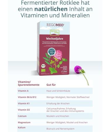 Quality from Denmark!Herren Mark is your specialist for the development and manufacture of nutritional supplements from herbal extracts, organically manufactured and fermented with lactic acid bacteria.For the well -being of man woman.100 vegan fermented: Without alcohol other preservatives - thanks to fermentation with lactic acid bacteria.Our red clover concentrate is also free of dyes, genetic engineering, lactose gluten.Vegan unpasteurized.Undiluted, purely concentrated extract mixture.Effect after 3-5 weeks: week 1-5: 120ml daily (2 cups each in the morning evening) take red kley drink with a meal.As soon as you notice an effect, the daily dose can be reduced to 60ml (1 mug in the morning evening).Buy 2 x 2l Regomeo now to have enough for min. 5 weeks.Individual dosage with max. Daily dose of 120ml (4 cups).Shake vigorously before use.Natural ingredients: With high-quality red clover extract, aromatic sage, fresh lemon balm peppermint, our dietary supplement is rich in phyto-Östrogens, also called isoflavone.These support women's estrogen budget in menopause.Support in menopause: they are more and more hot, they suddenly sweat a lot more and often feel restless and restlessRegomeo accompanies you with valuable red clover, and supports you in hot flashes, strong sweating, fatigue insomnia.Peppermint promotes natural digestion, and sage contributes to normal mobility and flexibility of the joints muscles.Lemon balm is responsible for a relaxing sleep and a balanced mood.QUALITÄT AUS DÄNEMARK! Herrens Mark ist Ihr Spezialist für die Entwicklung Herstellung von Nahrungsergänzungsmitteln aus Kräuter-Extrakten, organisch hergestellt und mit Milchsäurebakterien fermentiert. Für das Wohlbefinden von Mann Frau. 100 VEGAN FERMENTIERT: Ohne Alkohol andere Konservierungsstoffe – dank Fermentierung mit Milchsäurebakterien. Unser Rotklee-Konzentrat ist zudem frei von Farbstoffen, Gentechnik, Laktose Gluten. Vegan unpasteurisiert. Unverdünnte, rein konzentrierte Extrakt-Mischung. WIRKUNG SCHON NACH 3-5 WOCHEN: Woche 1-5: täglich 120ml (morgens abends je 2 Becher) Rotklee-Getränk mit einer Mahlzeit einnehmen. Sobald Sie einen Effekt bemerken, kann die Tagesdosis auf 60ml (morgens abends je 1 Becher) reduziert werden. Kaufen Sie jetzt 2 x 2l REGOMEO, um genug für min. 5 Wochen zu haben. Individuelle Dosierung mit max. Tagesdosis von 120ml (4 Becher). Vor Gebrauch einmal kräftig schütteln. NATÜRLICHE INHALTSSTOFFE: Mit hochwertigem Rotklee-Extrakt, aromatischem Salbei, frischer Zitronenmelisse Pfefferminze ist unser Nahrungsergänzungsmittel reich an Phyto-Östrogenen, auch Isoflavone genannt. Diese unterstützen den Östrogenhaushalt von Frauen in der Menopause. UNTERSTÜTZUNG IN DER MENOPAUSE: Ihnen ist immer öfter heiß, Sie schwitzen plötzlich viel mehr und fühlen sich oft unruhig und rastlosREGOMEO begleitet Sie mit wertvollem Roten Klee, und unterstützt Sie bei Hitzewallungen, starkem Schwitzen, Müdigkeit Schlaflosigkeit. Pfefferminze fördert die natürliche Verdauung, und Salbei trägt zu einer normalen Beweglichkeit und Flexibilität der Gelenke Muskeln bei. Für erholsamen Schlaf und ausgeglichene Grundstimmung ist Zitronenmelisse zuständig.REGOMEO Rotklee-Extrakt 2 Liter für die Wechseljahre I Rotklee für Ruhe Ausgeglichenheit in der Menopause I unterstützt bei Müdigkeit, Schlaflosigkeit Hitzewallungen I mit pflanzlichem Östrogen REGOMEO 2 l