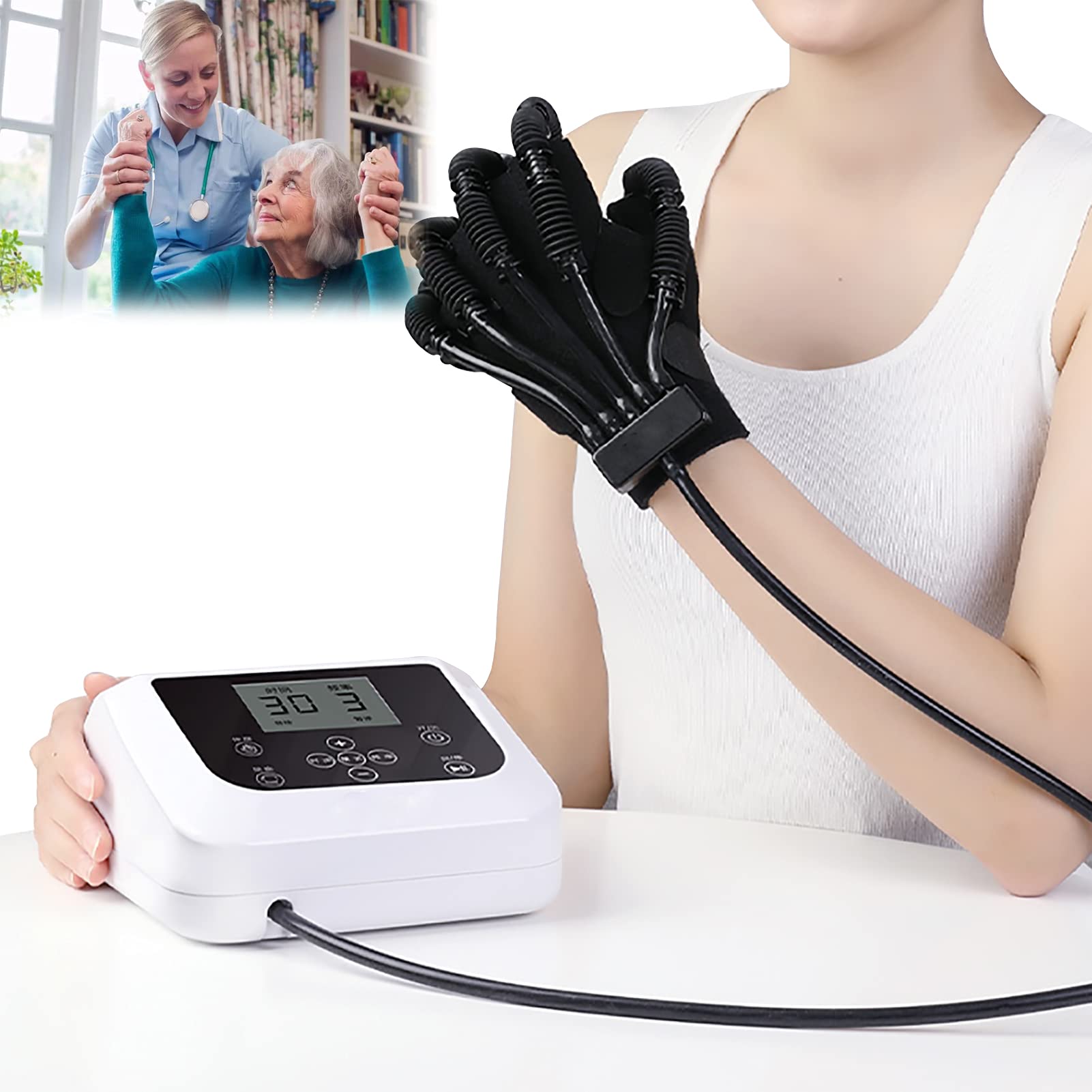 ?Help self-repair?: Simultaneous movement of both hands can activate mirror neurons, replicating normal neural pathways from the hand to the affected area, thus promoting autonomous brain recovery. ?Adjustable strength?: Adjustable strength according to your specific situation, no matter how strong you are, within the safety range, no need to worry about the strength. ?Rehabilitation robot gloves for people?: finger flexion spasm, cerebral palsy, finger dysfunction caused by stroke sequelae, long working hours can restore the dual function of fingers and hands. ?Rehabilitation robot gloves mode?: Passive mode allows the trained hand to learn the movements of other hands. ?Material of rehabilitation robot gloves?: soft polymer gloves, a variety of flexible polymer materials, three-dimensional cutting, suitable for human hands, flexible air hand drive, simple and convenient.