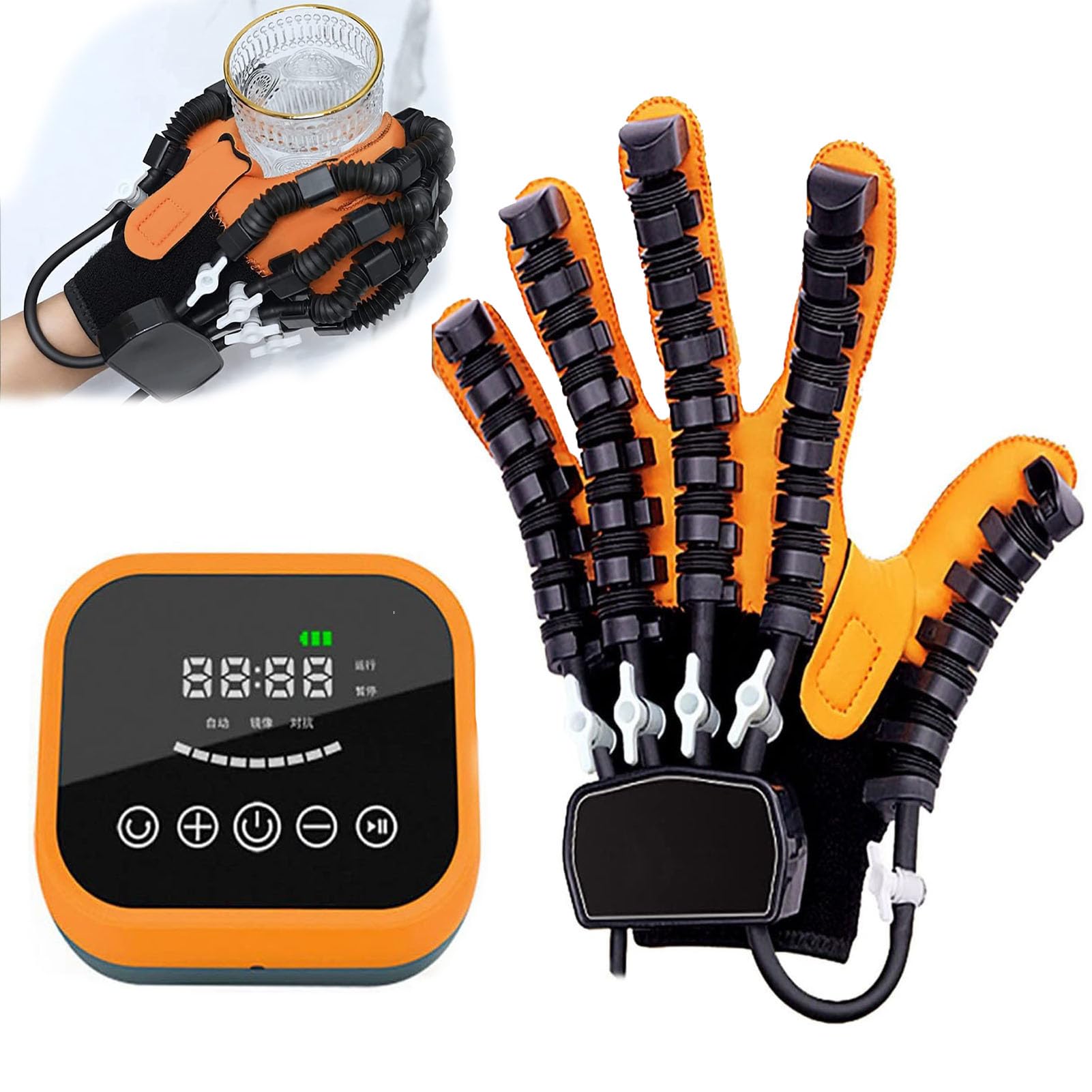 ? APPLICABLE TO THE CROWD:These rehabilitation robot gloves are ideal for the rehabilitation of hand motor function of patients with stroke, great for Hand Therapist , hemiplegia, and poor finger mobility. The stroke hand therapy equipment can prevent and correction of contracture stiffness and wrist extensor. EASY TO USE:The lightweight and small size makes it very convenient to store and carry. This rehab glove will solve the problem that going to a rehabilitation facility is expensive and time-consuming, and that you cannot do rehabilitation on your own without specialised rehabilitation equipment when you go home from the hospital. PASSIVE TRAINING OF HAND FUNCTION:Rehabilitation treatment device only needs to connect rehabilitation gloves, and it can be easily used by grasping objects such as training balls. At the same time, it has an intelligent flexion and extension degree adjustment function. You can freely adjust the strength of flexion and extension according to the different muscle tension. MULTI-FUNCTION:This hand rehabilitation Robot Gloves not only trains hand flexion, extension, and hand grip strength but also can restore neurons through bimanual mirror training, driving the other hand to move synchronously with your healthy hand. UPGRADED PRODUCT:This product is an upgraded version of the rehabilitation glove, adding multiple knuckles to each finger to significantly improve glove dexterity and mobility.