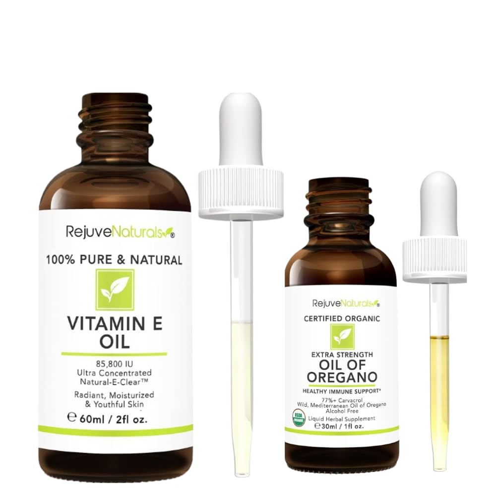 Discover total-body wellness with the RejuveNaturals Inner Outer Wellness Bundle, featuring two of nature's most potent oils: 100 Pure Vitamin E Oil and USDA Organic Extra Strength Oil of Oregano. Formulated to work together, this bundle helps nourish your skin from the outside while supporting immune health from the inside — a simple, natural way to look and feel your best every day. Our Vitamin E Oil (85,800 IU, d-alpha tocopherol) is 100 natural and derived from non-GMO organic olives — never synthetic. It absorbs quickly to moisturize, smooth, and revitalize skin while helping reduce the appearance of scars, wrinkles, and sun damage. Our Extra Strength Organic Oil of Oregano delivers powerful immune support with wild, Mediterranean oregano containing a minimum of 77 Carvacrol — a naturally occurring compound known for its strong antioxidant and cleansing properties. Blended with organic extra virgin olive oil, this concentrated formula provides around 200 servings per bottle for ongoing wellness. Together, these two premium oils deliver comprehensive support for health and beauty, inside and out. Vegan, gluten-free, and cruelty-free — with no artificial additives — this bundle is the clean, effective way to fuel your natural vitality.Premium Quality, Ethically Made in the USA: RejuveNaturals products are proudly made and bottled in the USA, cruelty-free, and third-party tested for purity and potency. Experience the natural synergy of two trusted oils for complete wellness, inside and out. Clean, Potent Easy to Use: Both oils are free from synthetic additives, chemicals, or preservatives. Vitamin E absorbs quickly without stickiness Oregano Oil comes with a convenient dropper for precise use — approximately 200 servings per bottle. Deeply Nourishing, Natural Vitamin E Oil: Our 100 Pure Natural Vitamin E Oil (d-alpha tocopherol) is extracted from non-GMO organic olives for superior purity and absorption. Helps improve the appearance of scars, age spots, stretch marks, and dryness for smooth, youthful-looking skin. Immune Boost from Wild Mediterranean Oregano: Formulated with USDA Certified Organic Oregano Oil (minimum 77 Carvacrol) in cold-pressed olive oil. Delivers concentrated, plant-powered support to promote a strong immune response year-round — gluten-free, vegan, and non-GMO. Dual Action Wellness Support – Inside Out: This exclusive RejuveNaturals bundle pairs two natural essentials — Extra Strength Organic Oil of Oregano for immune defense, and 100 Pure Vitamin E Oil for radiant, healthy-looking skin. Support your body's resilience while enhancing skin's natural glow.
