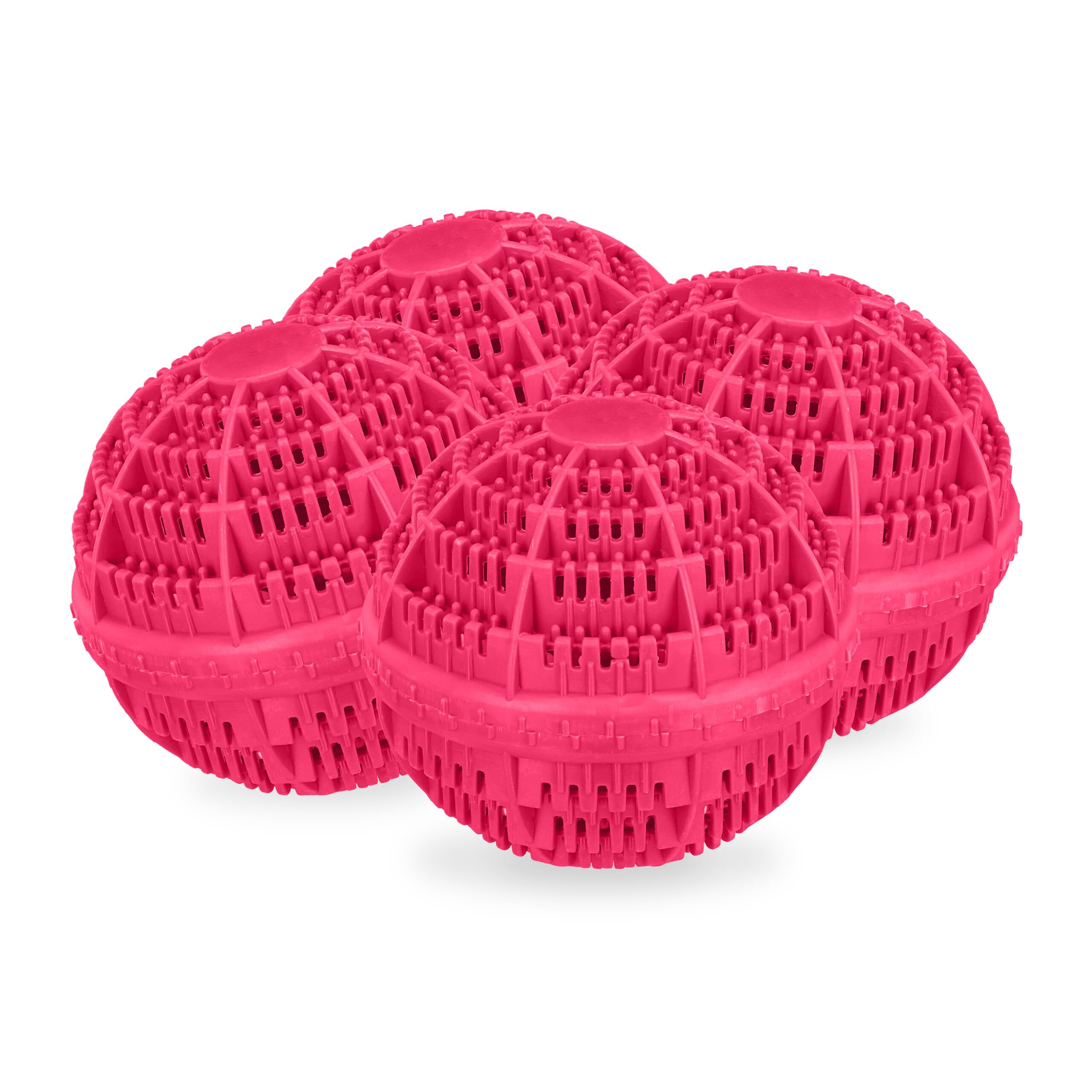 These laundry balls allow you to wash your clothes completely without detergent. Not only does this save money, it also helps the environment by eliminating packaging waste and chemicals. The balls are filled with ceramic beads that enrich the water with negatively charged ions, boosting natural washing power. Depending on the load, place one or both balls in the machine with the laundry. The balls can be washed at up to 90 C and used up to 1000 times.Washing ball in detail- Dimensions H x D: approx. 9.5 x 10.5 cm- Weight: approx. 210 g each- Material: TPR, ceramic- Colour: Pink- Set of 4Washing balls for the washing machine- Wash laundry without detergent- Saves money and protects the environment- Suitable for all textile types- For washing programmes up to 90 C- Without surfactants, bleach and fragrances- Ideal for sensitive skin and babies- Can be reused up to 1000 timesIncluded in delivery- 4x laundry ball- Decorative items are not included in the scope of delivery