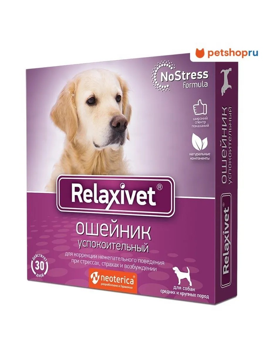 Когда питомцы нервничают, они начинают плохо себя вести: постоянно мяукают или лают, портят мебель и оставляют метки, проявляют агрессию или пугливость. Решить проблемы и успокоить питомца помогут натуральные средства Relaxivet. Используйте Relaxivet собакам для коррекции поведения, при стрессе, фобиях и возбуждении. Успокоительный ошейник Relaxivet благотворно влияет на нервную систему, способствует снятию нервного напряжения и беспокойства у животных, особенно при адаптации к новым условиям и половом возбуждении.
