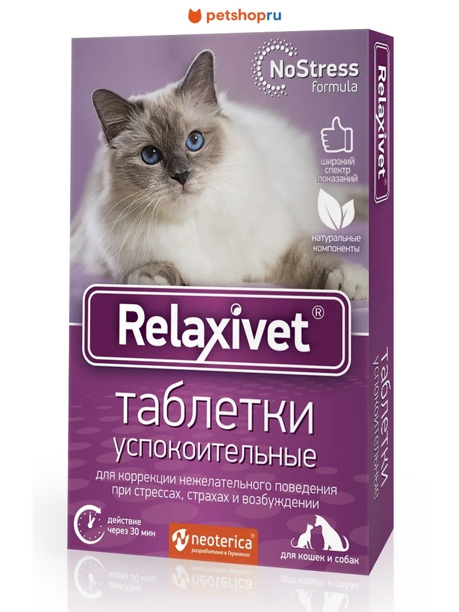 Relaxivet calming tablets have a beneficial effect on the nervous system, helping to relieve nervous tension and anxiety in animals, especially during transportation, visits to the veterinarian or exhibitions, and with fear of loud noises and explosions, as well as stress prevention.